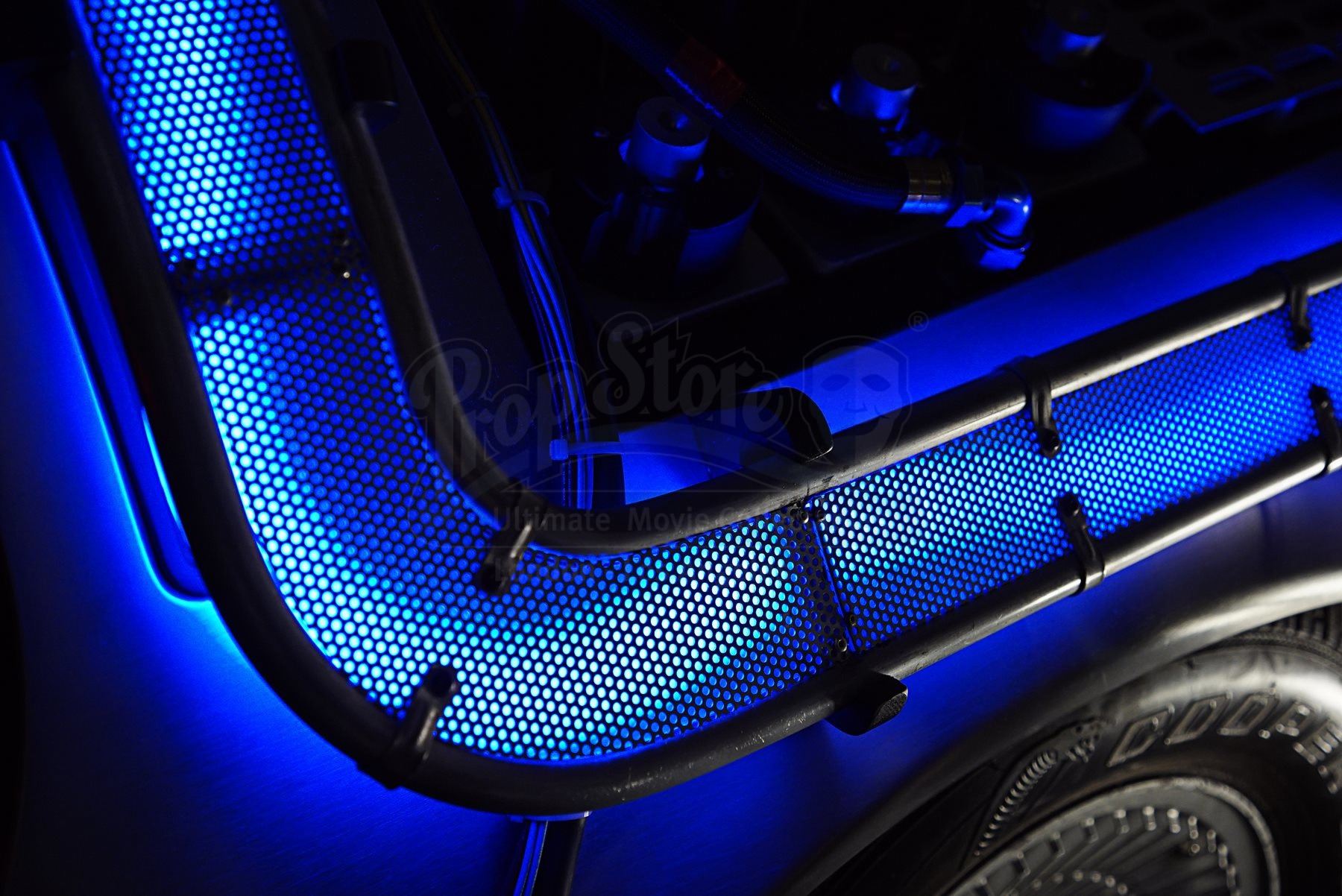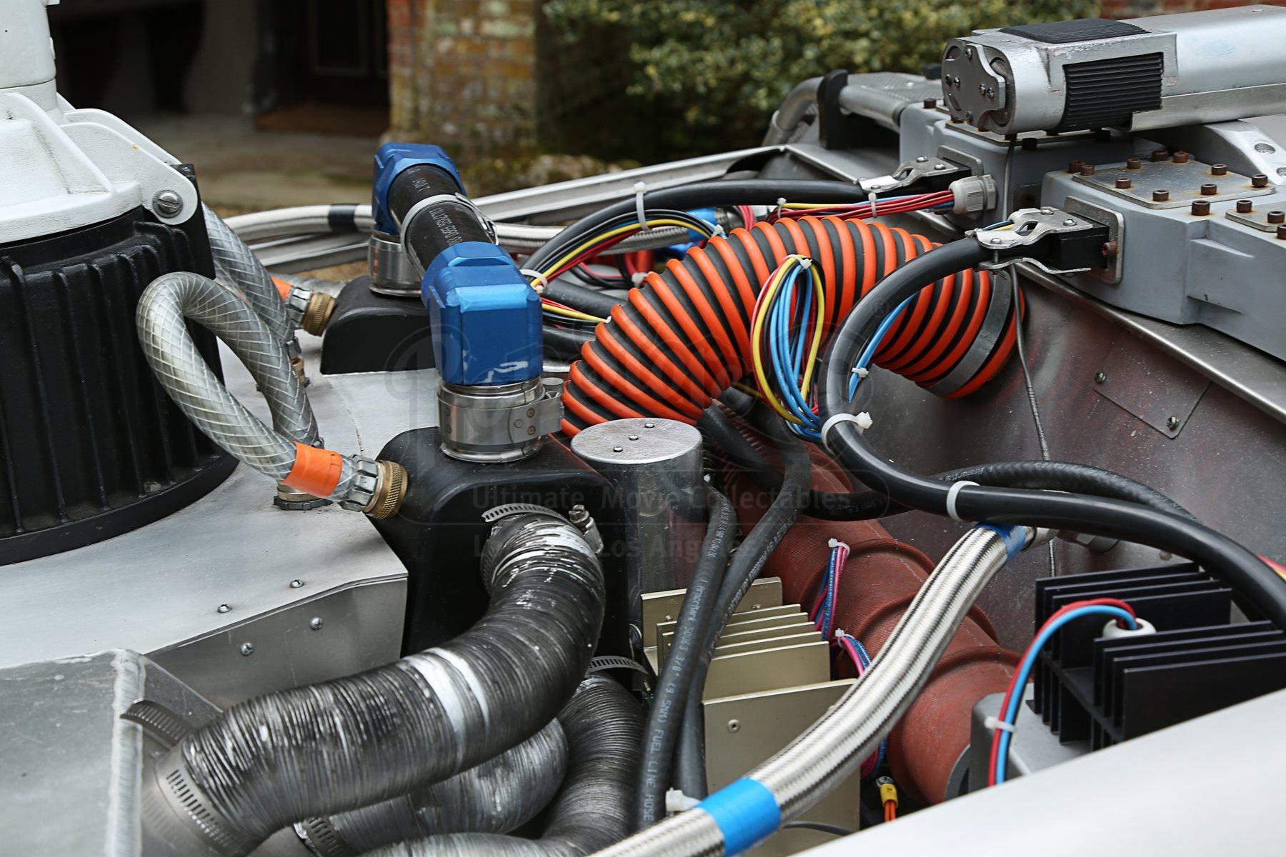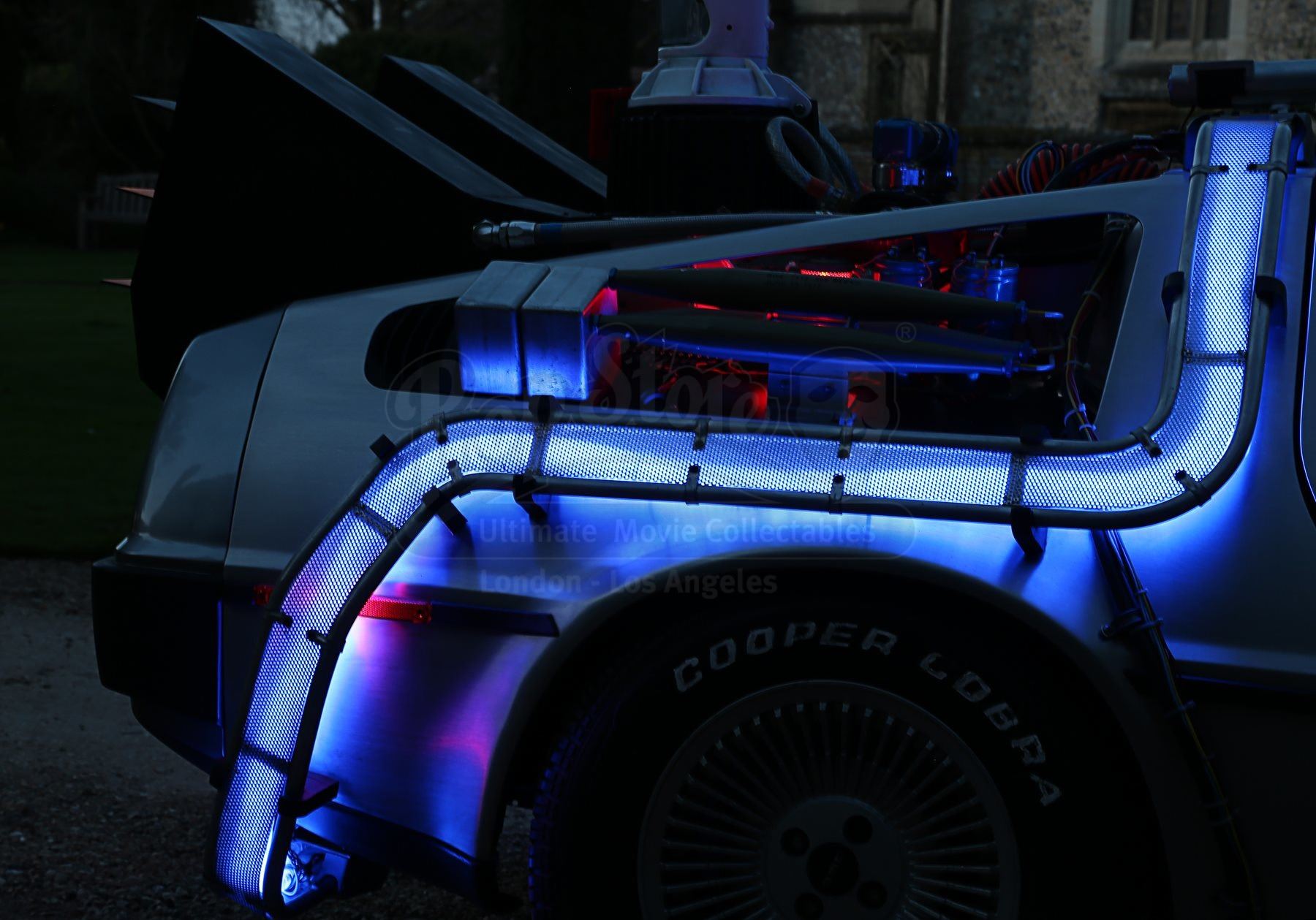 The car includes a fog machine hooked up to the rear vents, and numerous sound clips can be played via internal and external speakers, all activated via remote control. A set of hover wheels are included which, when clipped over the standard wheels, give the illusion of flying. The final addition is a replica Mattel Hoverboard which stands to the side of the car for the complete time-travel experience. The car’s heat sink has been autographed by Christopher Lloyd and franchise co-creator Bob Gale. A spare heat sink is also provided.