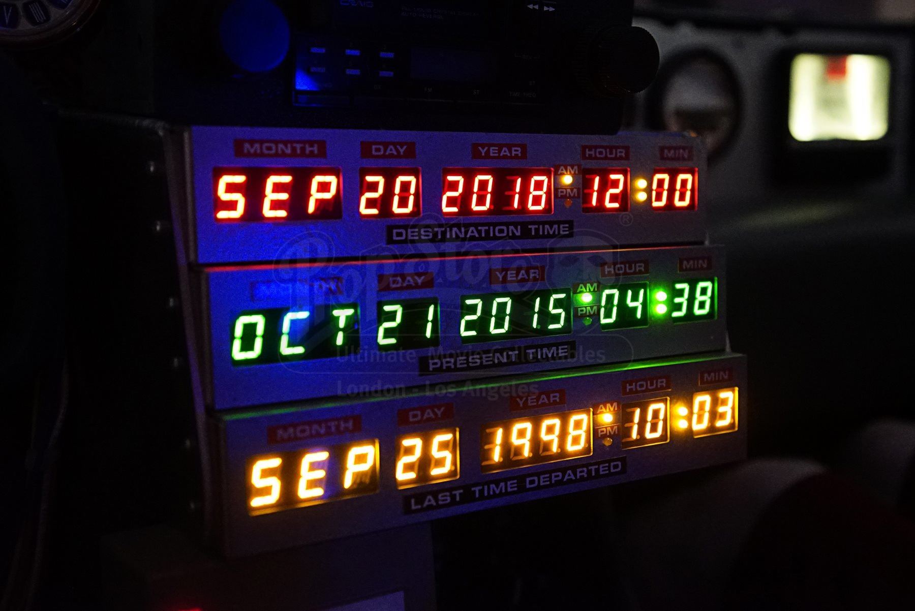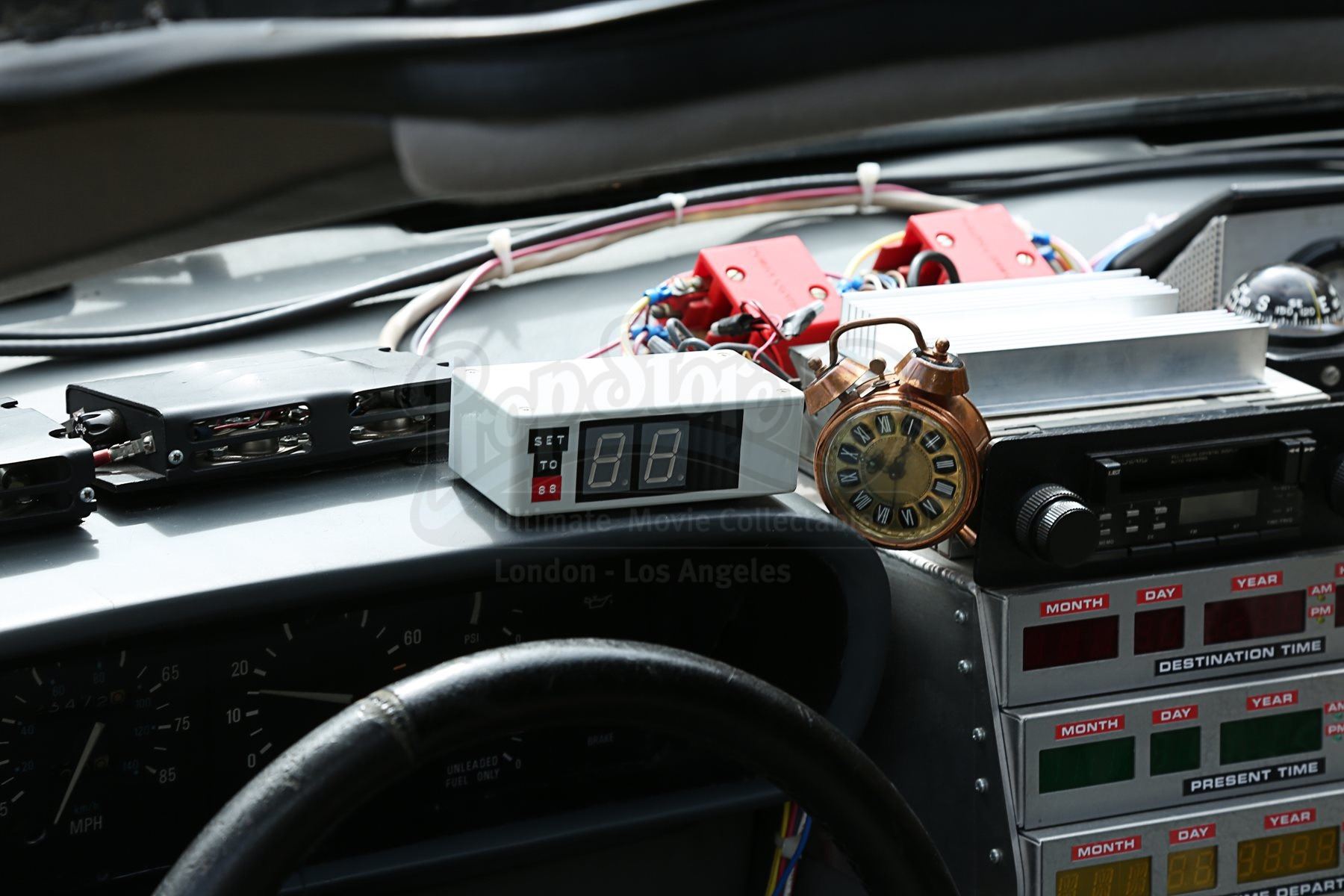 Every added component functions as it does in the movies (apart from enabling actual time travel, of course). Dates can be inputted into the time circuits while producing the correct sound effects. Should one be driving and hit 88mph, time-travel mode will activate, causing the Flux Capacitor to illuminate and sound effects to play (legal disclaimer: driving at 88 mph is illegal in most countries and is generally frowned upon). The time-travel mode feature is also accessible via the remote control while the car is stationary. The Flux Capacitor, fluxes, doors and Mr. Fusion make the correct noises when opened.