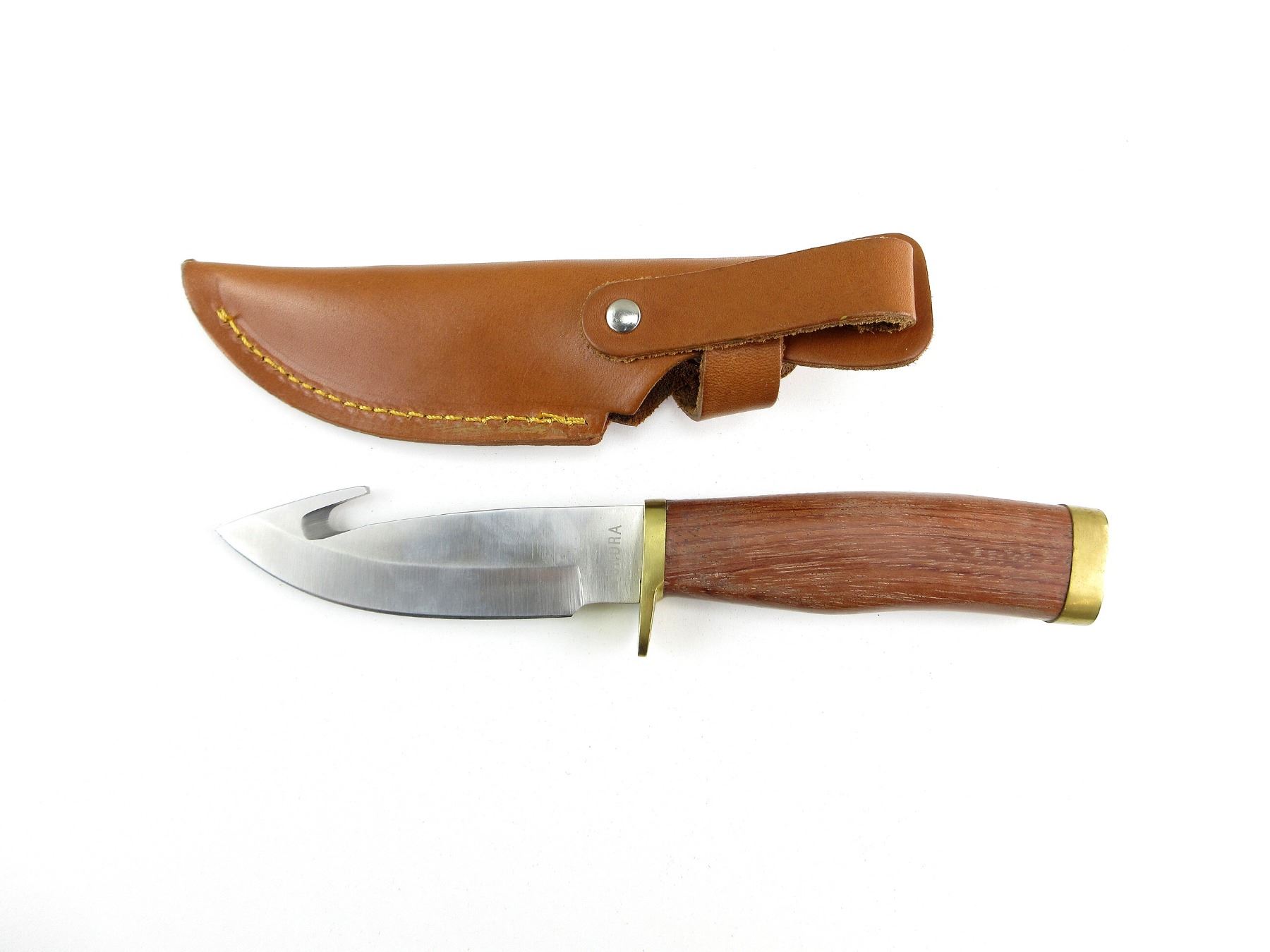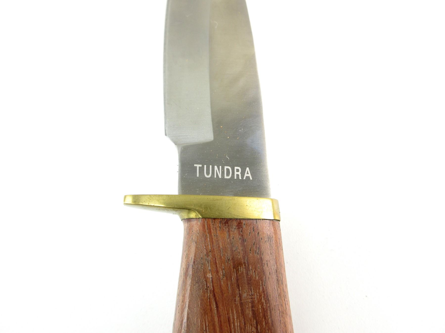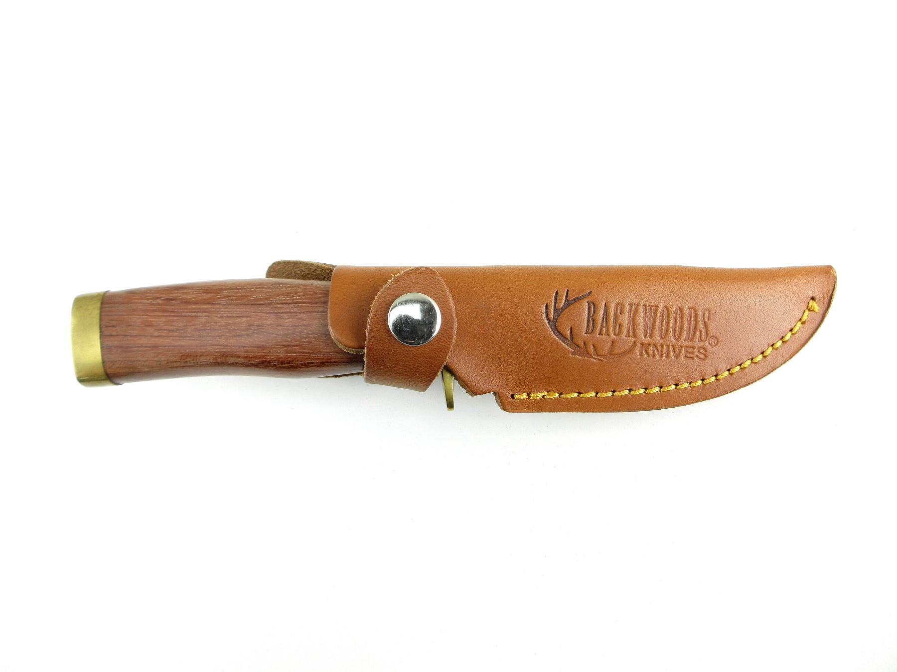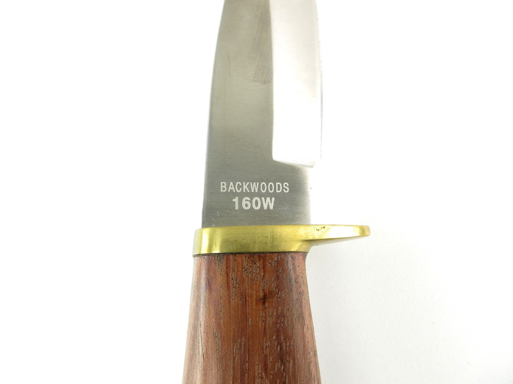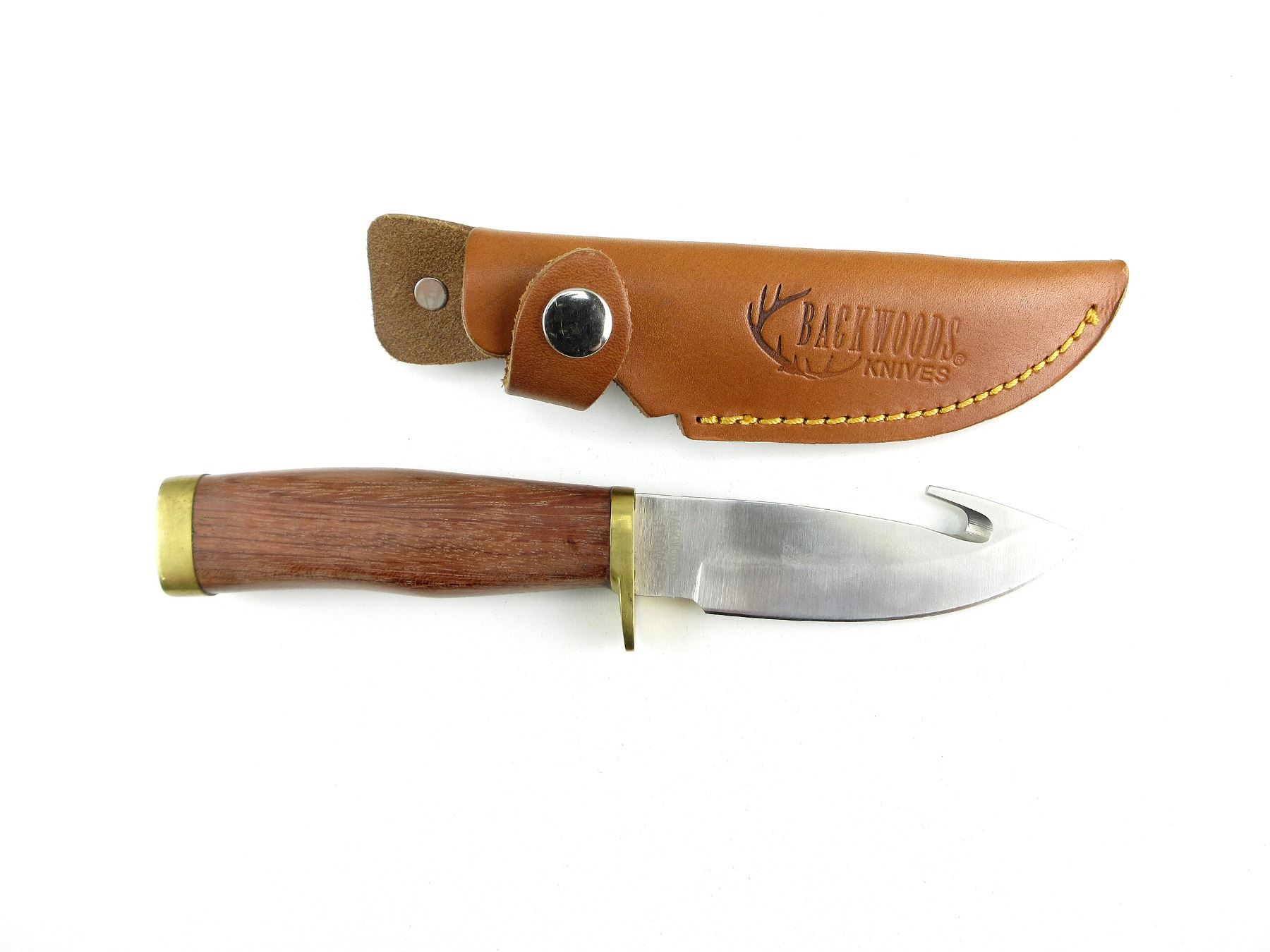 (1) FIXED BLADE KNIFE WITH GUT HOOK, STEEL SHARPENED BLADE, MARKED: "BACKWOODS, 160W", OTHER-SIDE MARKED: "TUNDRA", WOODEN HANDLE, BROWN LEATHER SHEATH, VARIOUS MARKINGS, BLADE APPROX. 4.25". SEE PHOTOS.