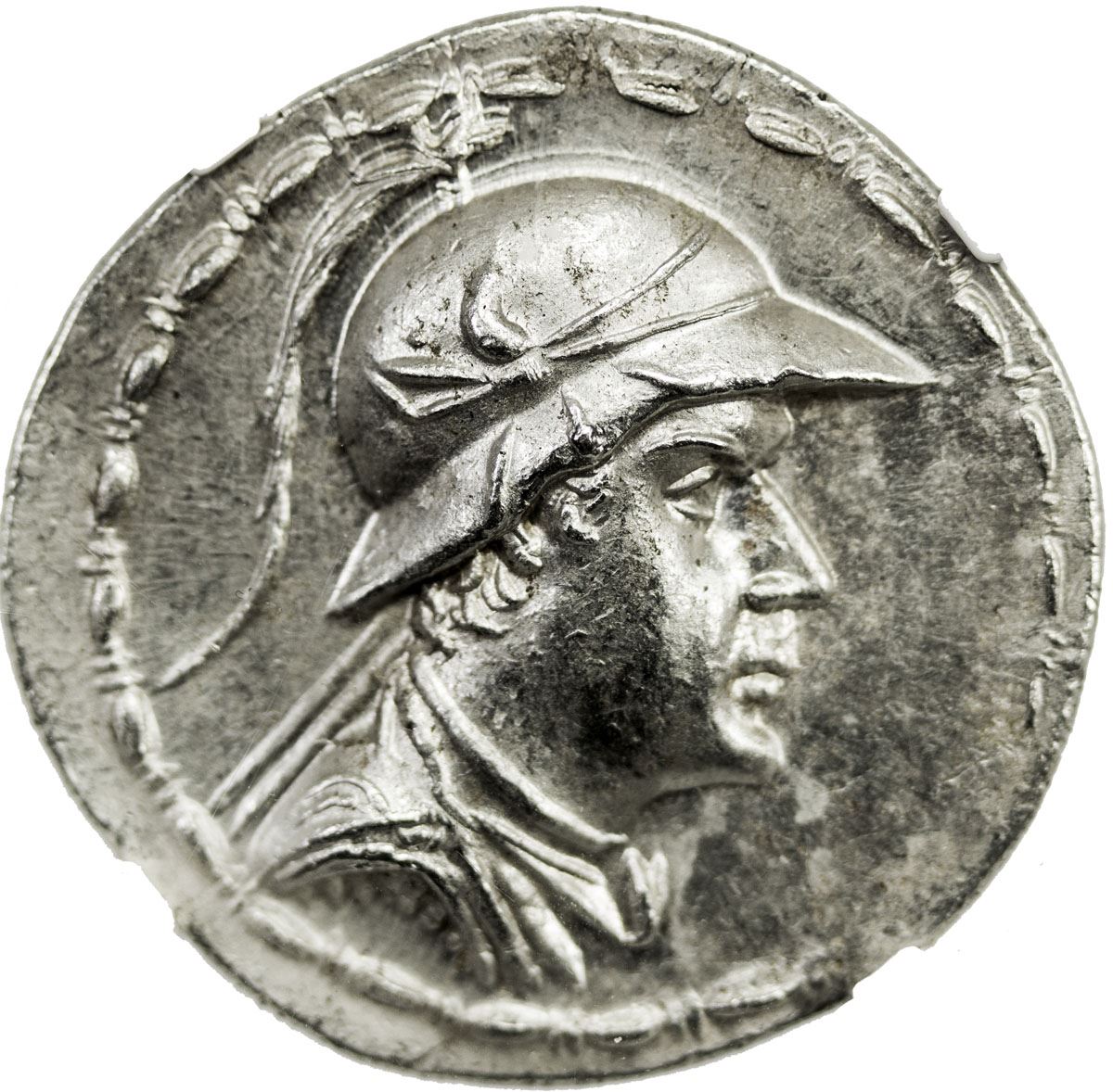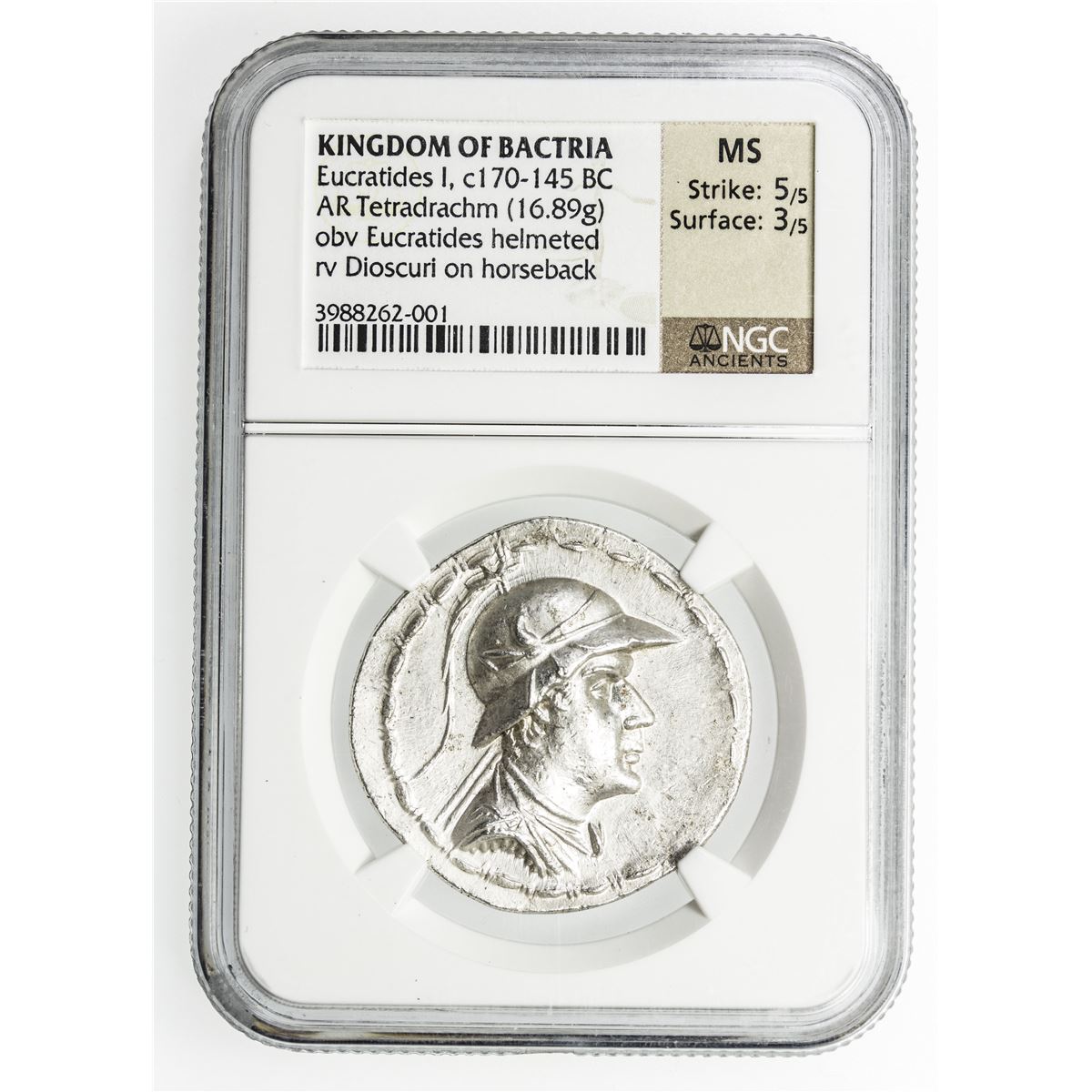 BACTRIA: Eucratides I, ca. 170-145 BC, AR tetradrachm (16.89g), Bop-6F, helmeted bust // dioscuri on horseback, holding lances, galloping right, bold strike, truly gorgeous, NGC graded Mint State. Also known as Eucratides the Great, Eucratides I was a descendent of one of Alexander the Great's dignitaries, and was one of the more notable Greco-Bactrian kings. He ended the Euthydemid Dynasty and began one of his own. He eventually gained territory as far as the Indus River in his battles with the Indo-Greek kings, but was finally defeated and pushed back to Bactria. His numismatic output was quite prolific, indicating an important ruler. It was documented that he was assassinated by one of his sons.