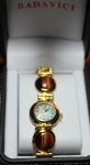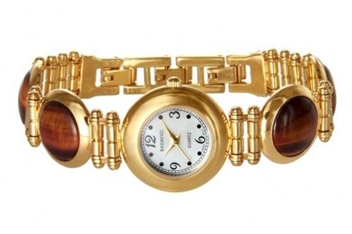 WOMEN'S BADAVICI RED TIGER EYE GEMSTONE BRACELET WATCH - STAINLESS STEEL CASE-BACK - WHITE MOTHER OF PEARL DIAL WITH BLACK ARABIC NUMBERS AT THE 3, 6, 9 AND 12 POSITIONS AND GOLD TONE HOUR, MINUTE AND SECOND HANDS - 18K GOLD PLATED - STAINLESS STEEL CASE BACK - 4 EA 14MM ROUND TIGER EYE (5.40CTS PER PIECE TOTAL 21.60CTS) - 8.5" OVERALL LENGTH WITH TWO REMOVABLE EXTENDERS