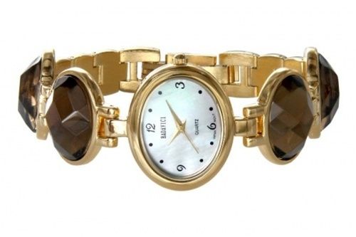 WOMEN'S BADAVICI SMOKEY QUARTZ GEMSTONE BRACELET WATCH - 18K GOLD PLATING - STAINLESS STEEL CASE-BACK - MOTHER OF PEARL DIAL WITH GOLD TONE ARABIC NUMBERS AT THE 3, 6, 9 AND 12 POSITIONS AND GOLD TONE HOUR, MINUTE AND SECOND HANDS - STAINLESS STEEL CASE BACK - FOUR LARGE 15 X 20 MM CHECKERBOARD FACETED OVAL SMOKY QUARTZ (14.40 CTS PER PIECE / TOTAL 57.6 CTW PER PEICE) - 7.75" OVERALL LENGTH