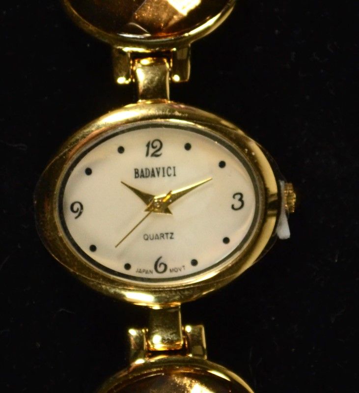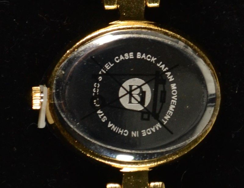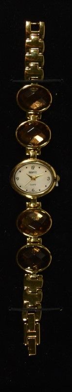 Smoky Quartz style stones on a gold plated watch band. Mother of Pearl face. Japan Movement. In original Box! Est. $50-$75