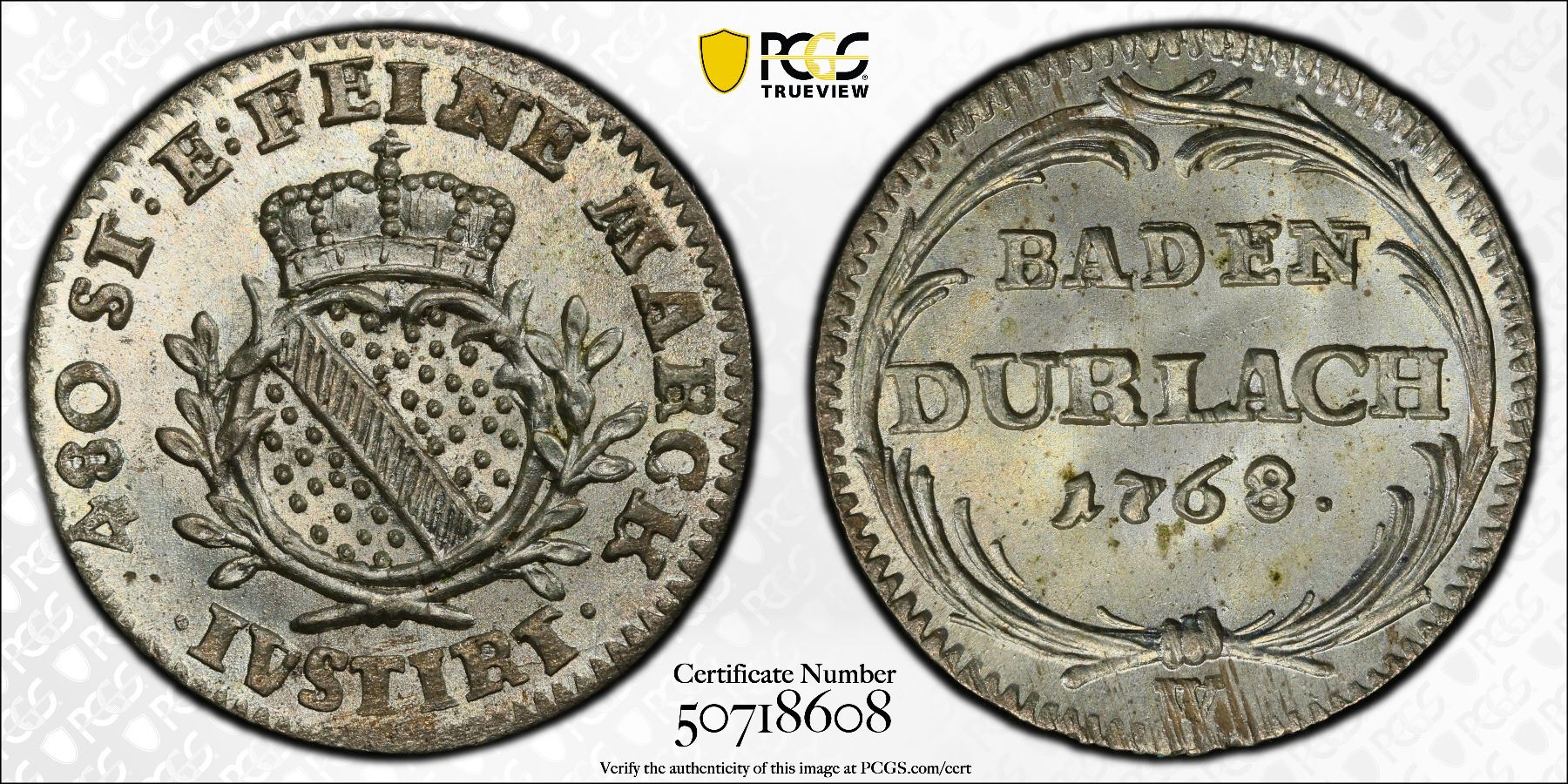BADEN-DURLACH: Karl I Friedrich, 1738-1771, AR 2-1/2 kreuzer, 1768, PCGS MS66
