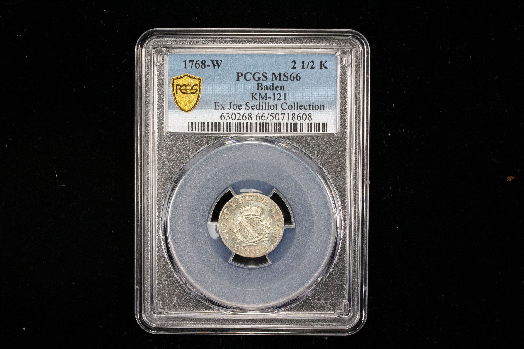 BADEN-DURLACH: Karl I Friedrich, 1738-1771, AR 2-1/2 kreuzer, 1768, KM-121, C-8, mint master initial W, a fantastic reflective mint state example! PCGS graded MS66, ex Joe Sedillot Collection.
