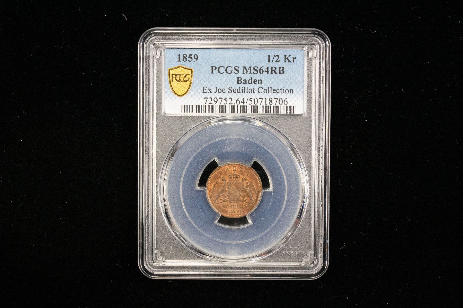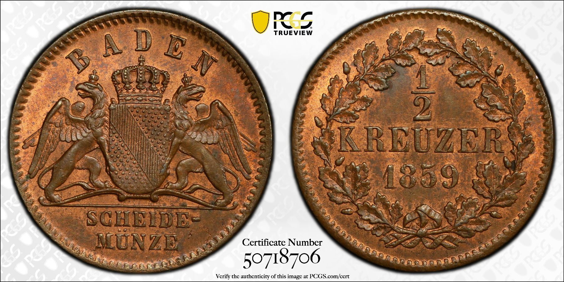BADEN: Friedrich I, 1856-1907, AE 1/2 kreuzer, 1859, KM-241, C-141, a wonderful lustrous caramel red brown mint state example! PCGS graded MS64 RB, ex Joe Sedillot Collection. In 1859, Baden, under the progressive Grand Duke Frederick I, was becoming one of the more liberal and modern German states. Reforms were reintroduced, censorship eased, and administrative improvements made. Rising nationalist sentiment and external events like the Italian war influenced Baden’s growing openness to German unification.