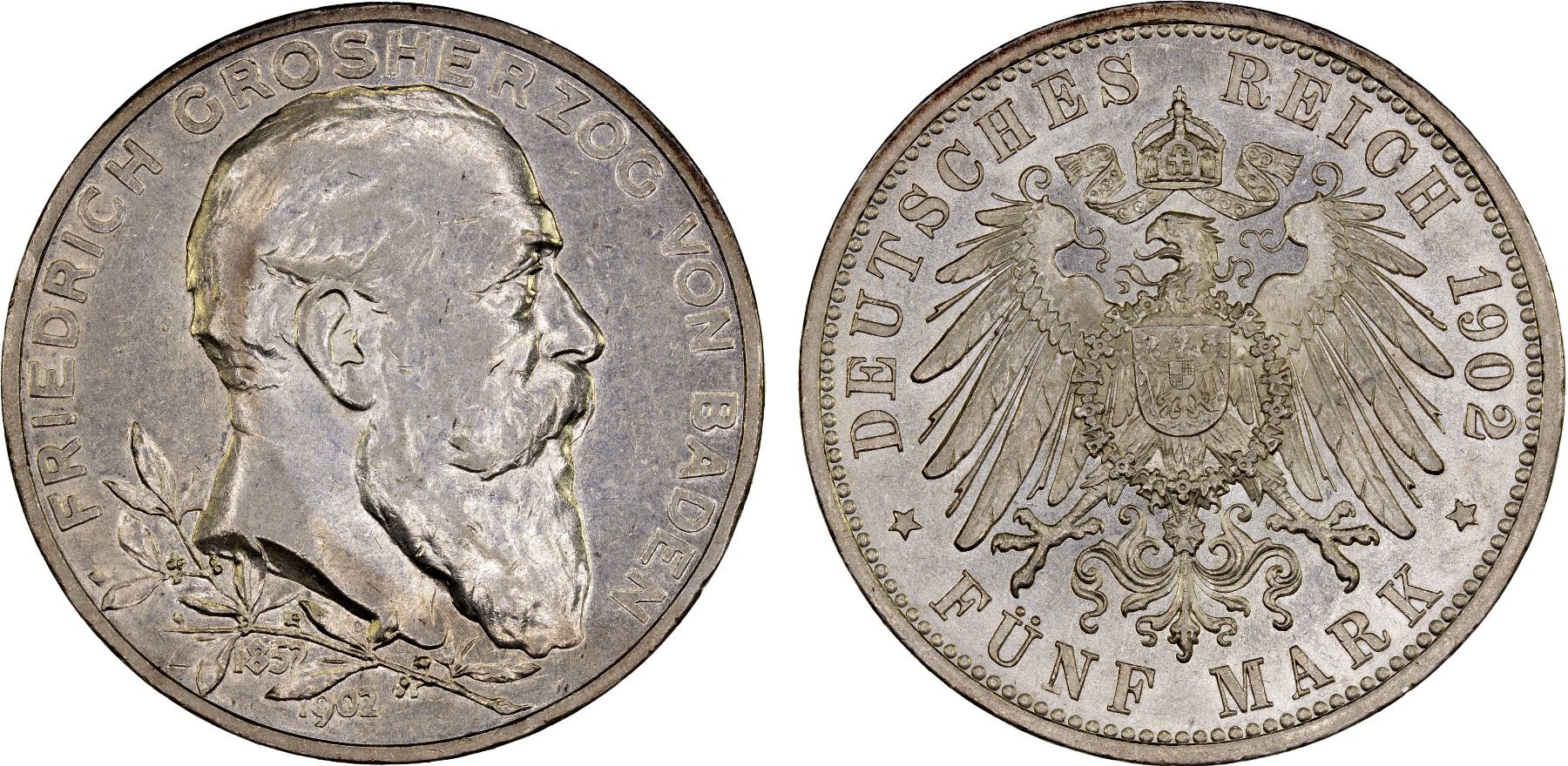 BADEN: Friedrich I, as Prince Regent, 1856-1907, AR 5 mark, 1902, XF