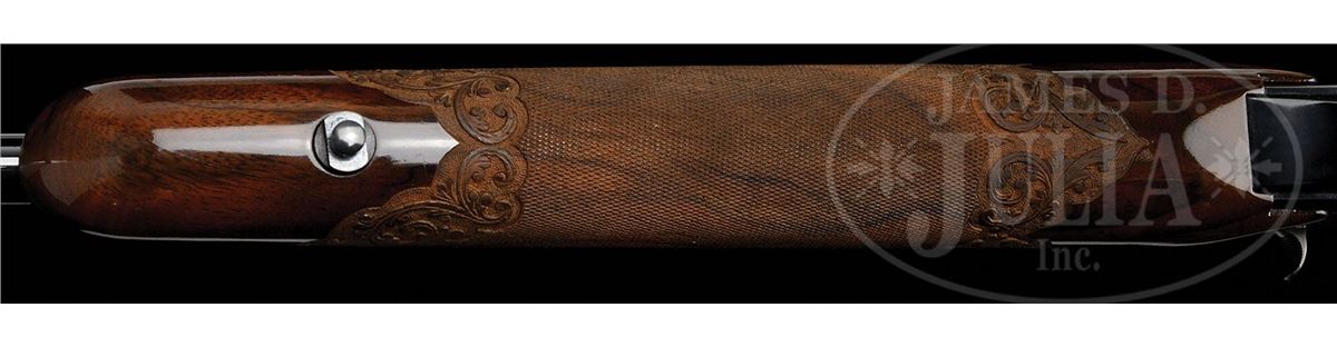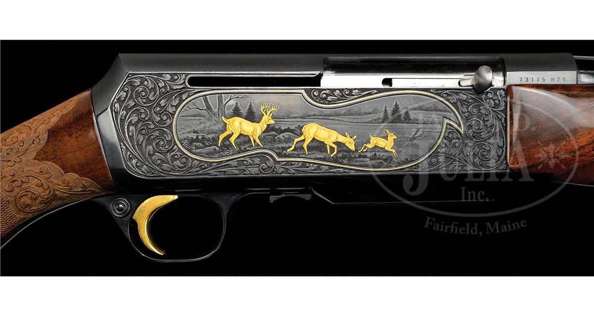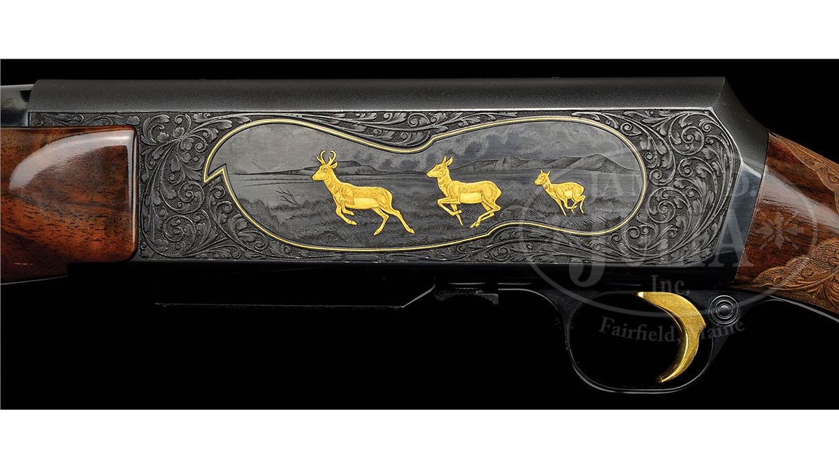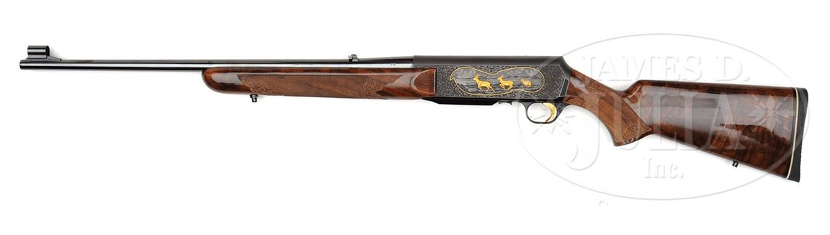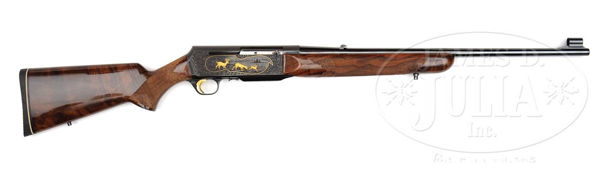 SN 73175M71. Cal. 30-06. Standard configuration and markings, with "MADE IN BELGIUM" under Browning address on left side of 22" bbl, mounted with adjustable U-notch folding rear sight, and gold bead front through matted ramp with hood. Blued action is engraved with very well cut, large, shaded scroll and acanthus with gold inlaid wire borders surrounding vignettes of semi-relief gold inlaid game animals in appropriate backgrounds; a paternity of pronghorn prance across prairie with mountains in background on left side, and family group of mule deer stroll into meadow on right. Game scenes are by noted Browning engraver "J. Baerten" whose signature appears in front of buck antelope on left side. "G. Marechal" who is responsible for the scroll has also signed the left side under scene. Burl figured claro walnut stocks are finely checkered and have full relief carved scrolled acanthus with stippled background framing checkering. Drop at heel: approx 2", drop at comb: approx 1-9/16". Weight: 7 lbs. 8 oz. LOP: 13-1/2" over thin black pad. CONDITION: Excellent, near new, appears unfired, with only a few minor handling marks in wood and metal, most notably a shadow on top of action where scope base was installed, and a couple of light pings on buttstock. Forend checkering is slightly darkened. 4-49164 MGM235