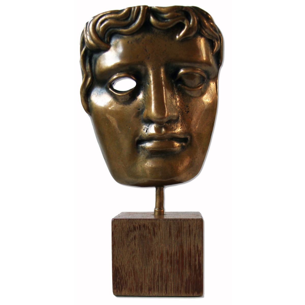 Impressive British Academy of Film and Television Arts award statue. The most prestigious media award in Britain is made of solid bronze, cast in the shape of a mask with one open eye. Mask's concave side features a symbol of the atom. This award was likely bestowed circa 1980. Measures 10.5'' in height and 6'' wide across the cheekbones. Wooden base measures 3.25'' square. Weighs 6 pounds, 8 ounces. Wood base needs refinishing, else near fine.
