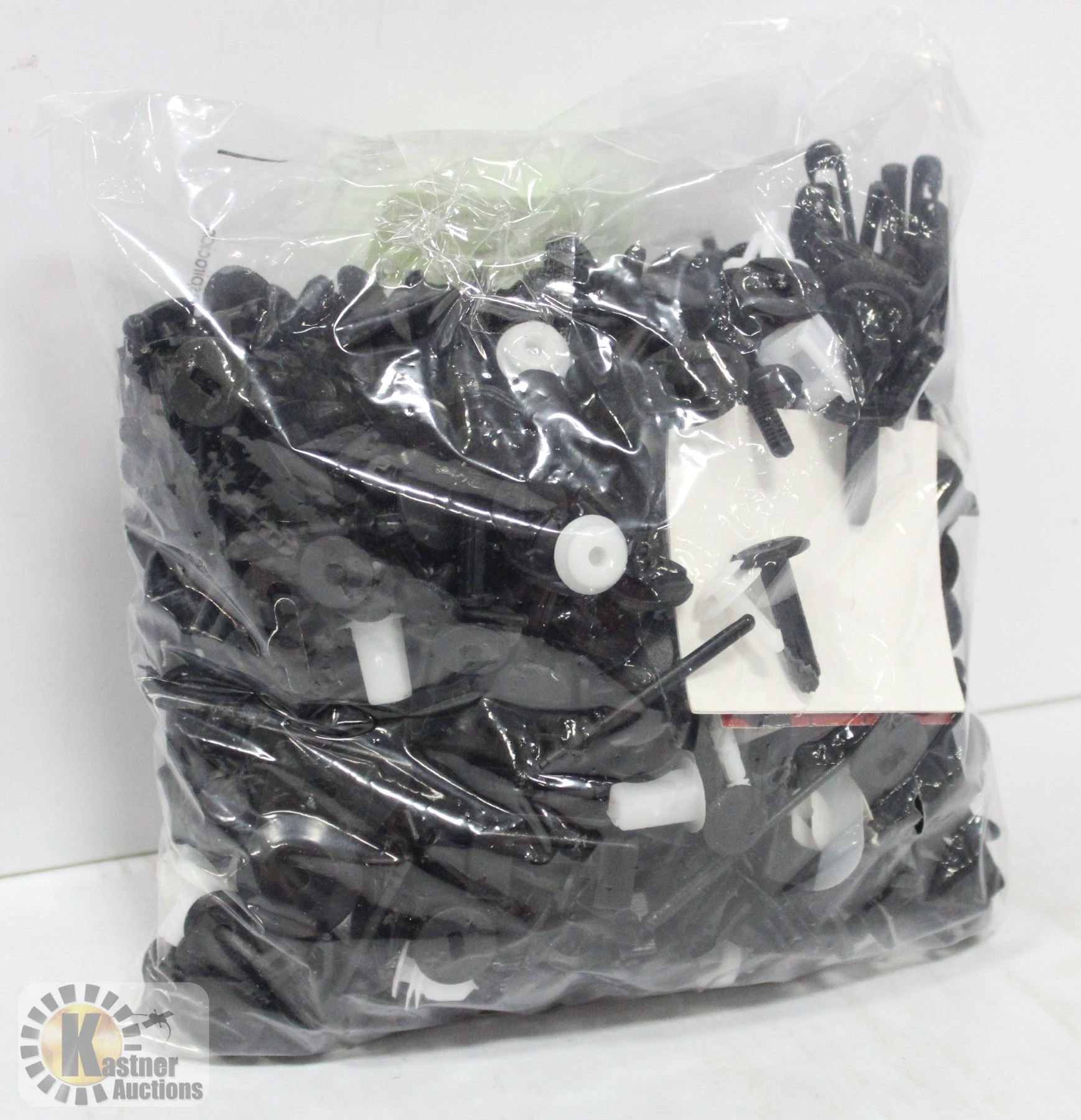 BAG OF APPROX. 1KG OF ASSORTED AUTOBODY CLIPS & INCLUDES DETAILING RAZORS