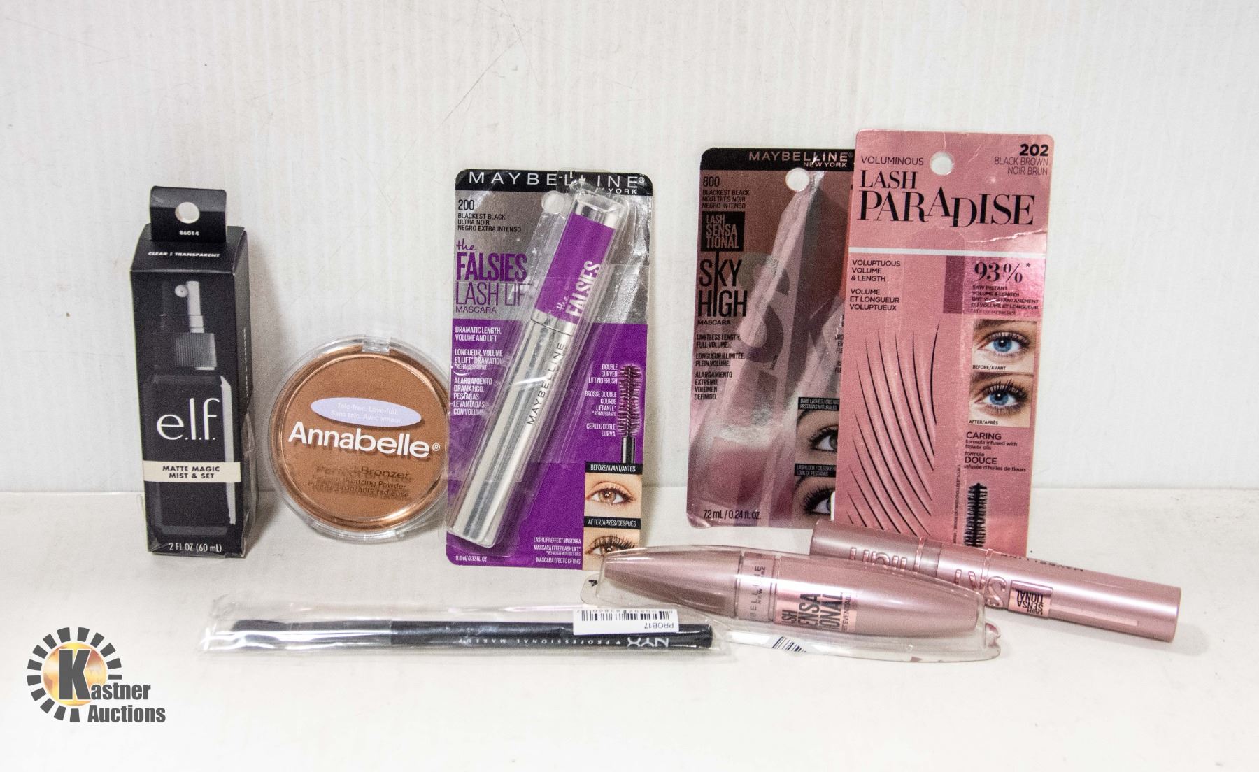 MATTE MAGIC MIST AND SET, ANNABELLE PERFECT BRONZER, MAYBELLINE SKY HIGH LASH SENSATIONAL MASCARA, MAYBELLLINE FALSIES LASH LIFT, LASH PARADISE MASCARA, NYX BRUSH. ALL NEW PRODUCTS, PACKAGING IS DAMAGED. AMZ SES