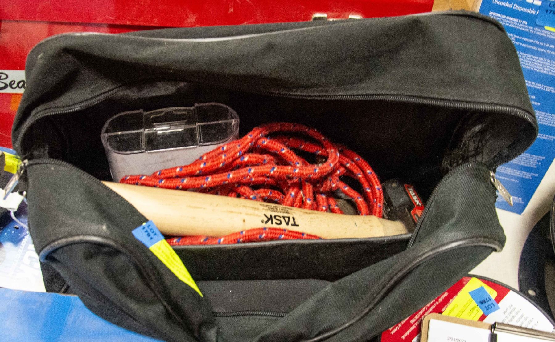 BAG OF ROPE, SMALL SLEDGEHAMMER, PRYBAR &
