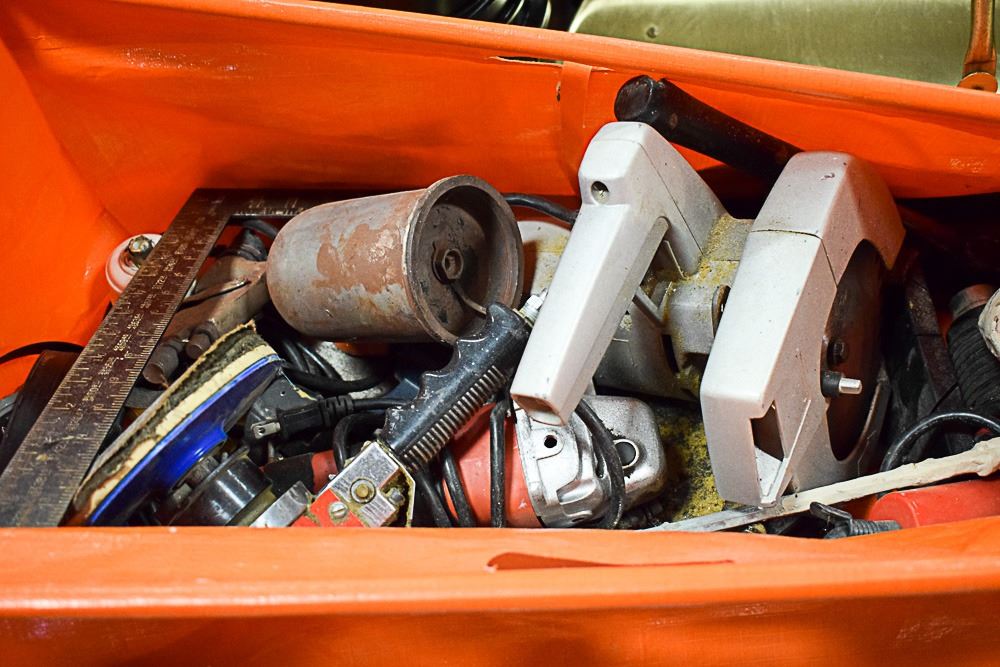 BAG OF TOOLS, SAWS, PAINT GUNS, ETC.