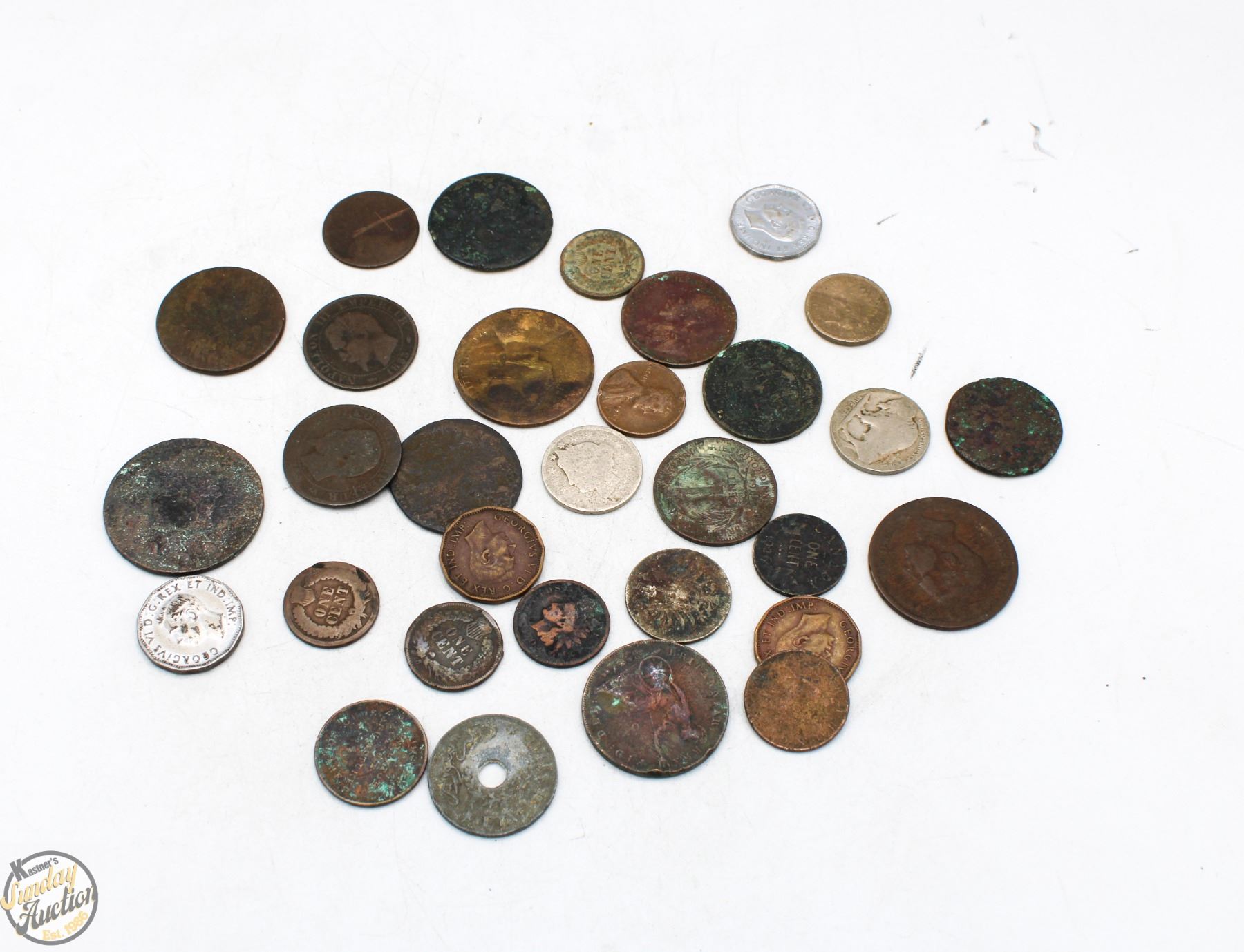 BAG OF VARIOUS OLD & WORN WORLD COINS ETC.