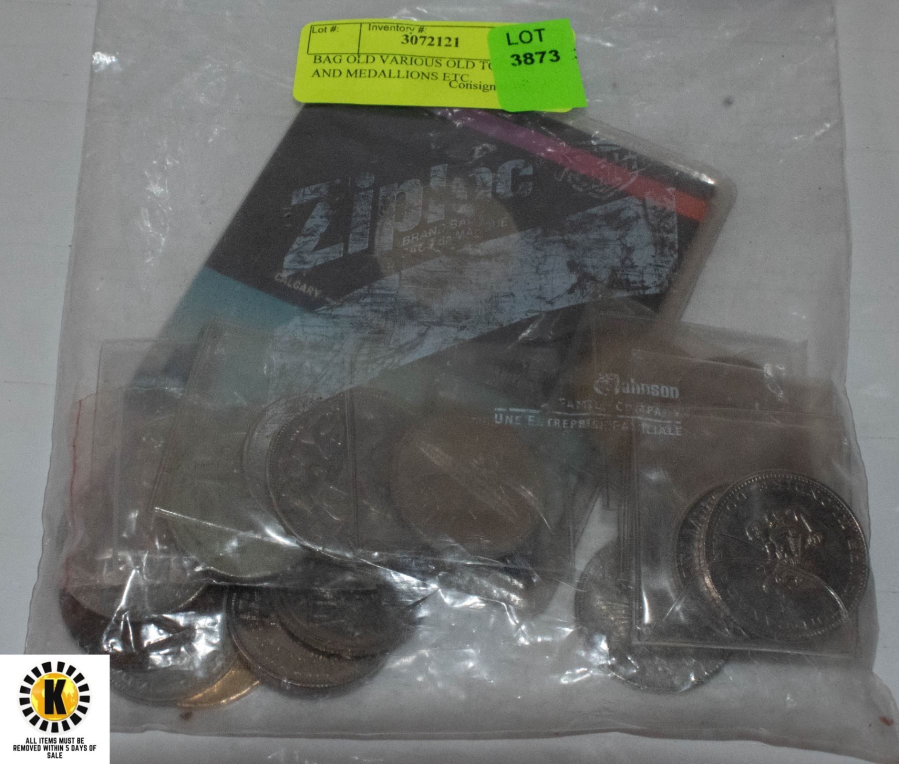 BAG OLD VARIOUS OLD TOKENS AND MEDALLIONS ETC.