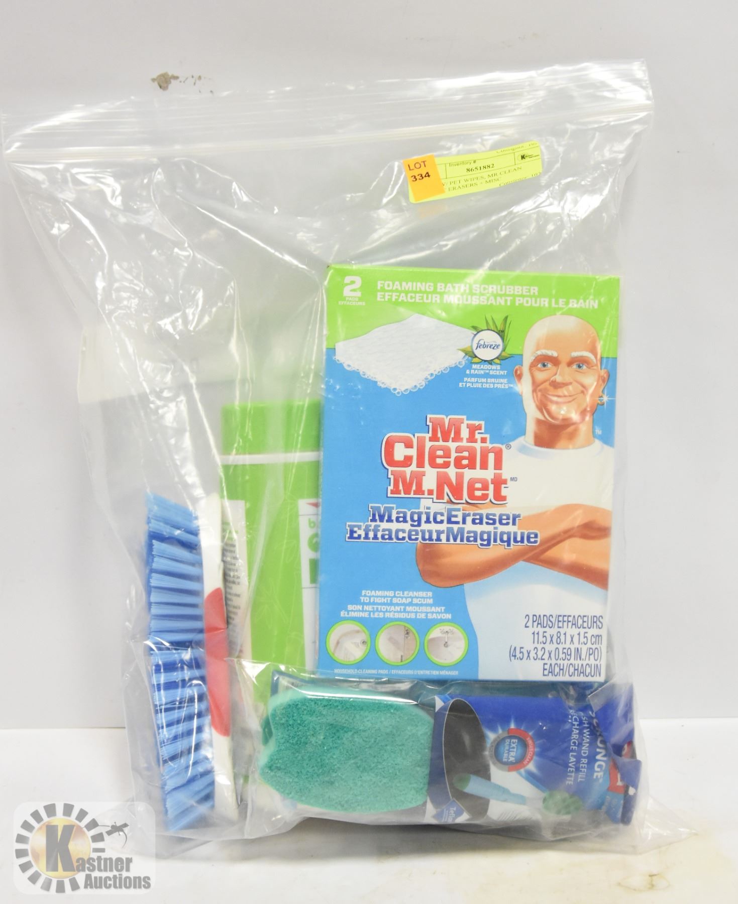 BAG W/ PET WIPES, MR CLEAN MAGIC ERASERS + MISC