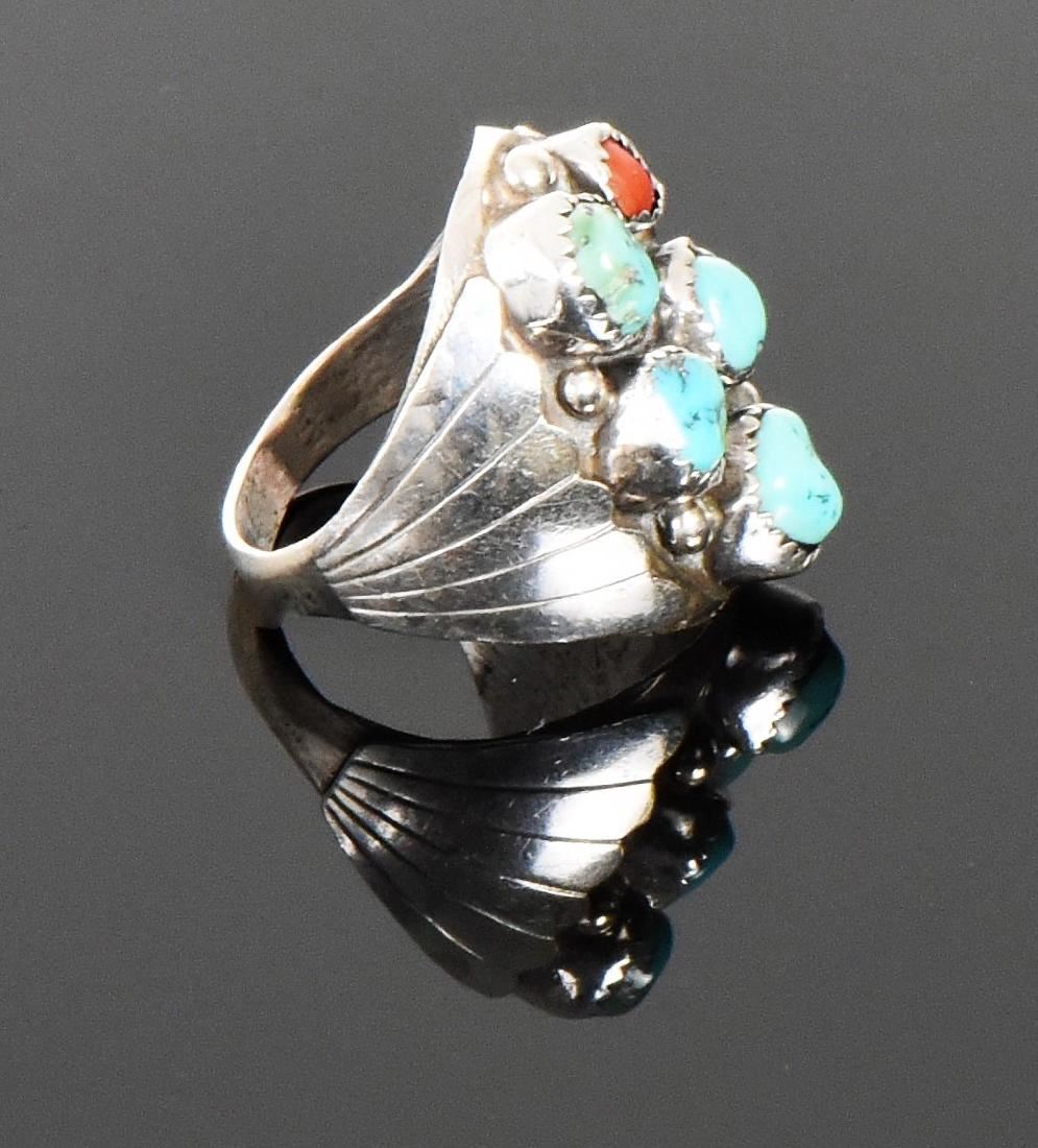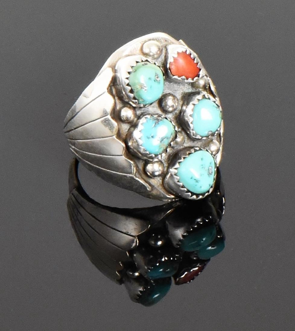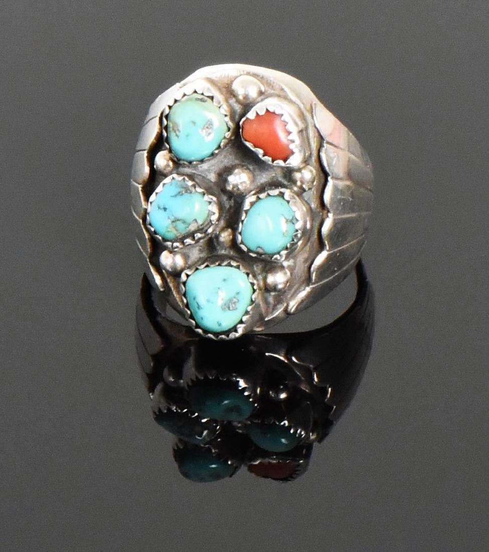 BAH, Native American Blue Turquoise And Red Coral Sterling Silver Ring. Ring Size: 10 Silver Tested. Estimated more than 50 yrs old. Native Americans also known as American Indians or just simply Indians are considered to be people whose pre-Columbian ancestors were indigenous to the lands within the nation's modern boundaries. These peoples were composed of numerous distinct tribes, bands, and ethnic groups, and many of these groups survive intact today as partially sovereign nations. The Iroquois, living around the Great Lakes and extending east and north, used strings or belts called wampum that served a dual function: the knots and beaded designs mnemonically chronicled tribal stories and legends, and further served as a medium of exchange and a unit of measure. The keepers of the articles were seen as tribal dignitaries. Pueblo peoples crafted impressive items associated with their religious ceremonies. Kachina dancers wore elaborately painted and decorated masks as they ritually impersonated various ancestral spirits. Sculpture was not highly developed, but carved stone and wood fetishes were made for religious use. Superior weaving, embroidered decorations, and rich dyes characterized the textile arts. Both turquoise and shell jewelry were created, as were high-quality pottery and formalized pictorial arts. Navajo spirituality focused on the maintenance of a harmonious relationship with the spirit world, often achieved by ceremonial acts, usually incorporating sand painting. The colors made from sand, charcoal, cornmeal, and pollen depicted specific spirits. These vivid, intricate, and colorful sand creations were erased at the end of the ceremony. (Wikipedia) Size: See Ruler Photo. (Photos Represent The Condition Of The Lot.)