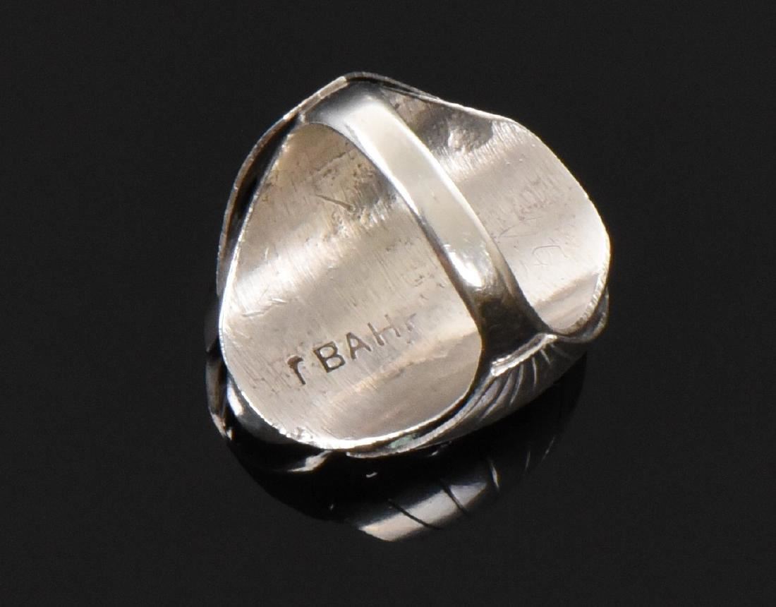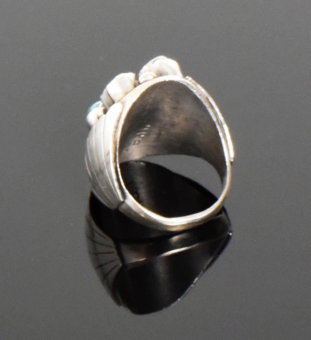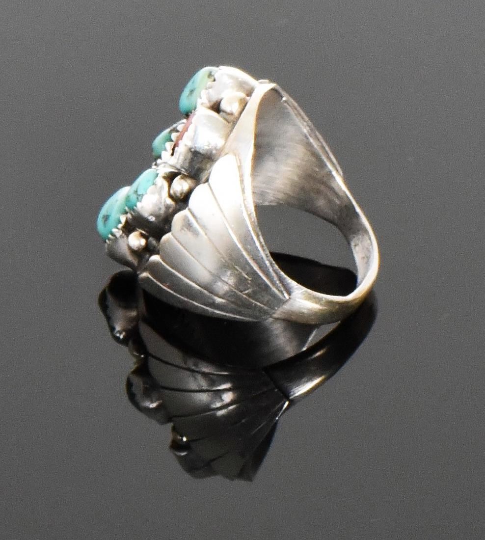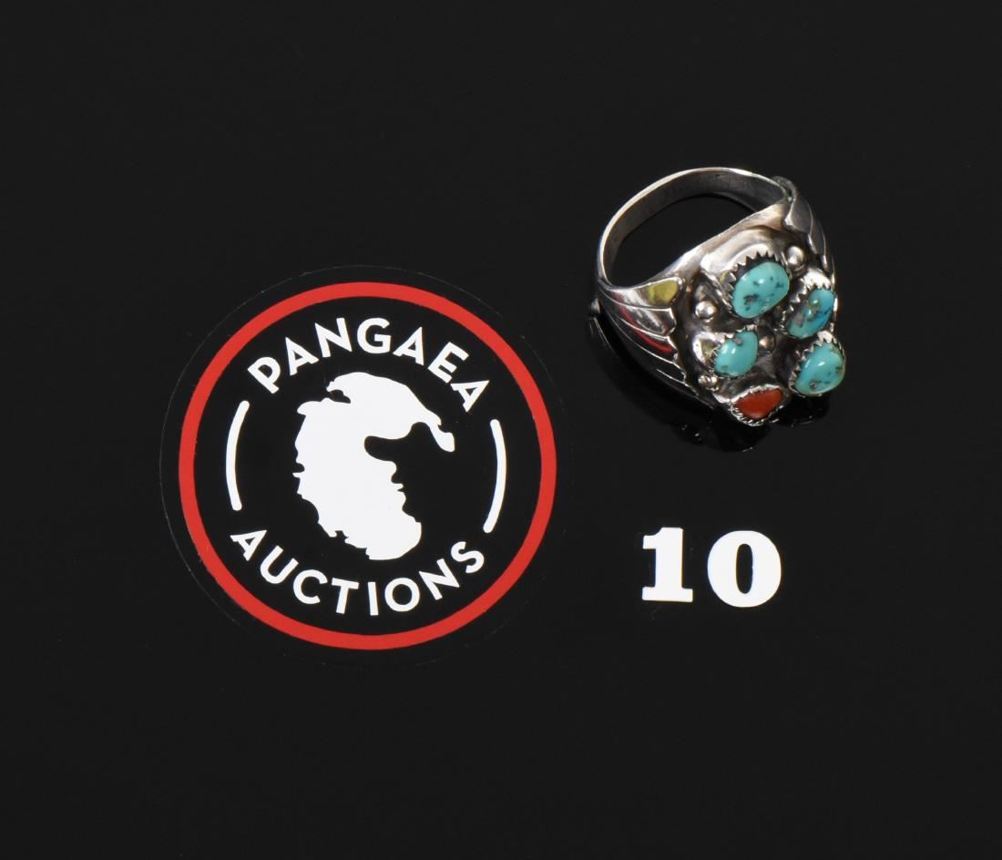 BAH, Native American Blue Turquoise And Red Coral Sterling Silver Ring. Ring Size: 10 Silver Tested. Estimated more than 50 yrs old. Native Americans also known as American Indians or just simply Indians are considered to be people whose pre-Columbian ancestors were indigenous to the lands within the nation's modern boundaries. These peoples were composed of numerous distinct tribes, bands, and ethnic groups, and many of these groups survive intact today as partially sovereign nations. The Iroquois, living around the Great Lakes and extending east and north, used strings or belts called wampum that served a dual function: the knots and beaded designs mnemonically chronicled tribal stories and legends, and further served as a medium of exchange and a unit of measure. The keepers of the articles were seen as tribal dignitaries. Pueblo peoples crafted impressive items associated with their religious ceremonies. Kachina dancers wore elaborately painted and decorated masks as they ritually impersonated various ancestral spirits. Sculpture was not highly developed, but carved stone and wood fetishes were made for religious use. Superior weaving, embroidered decorations, and rich dyes characterized the textile arts. Both turquoise and shell jewelry were created, as were high-quality pottery and formalized pictorial arts. Navajo spirituality focused on the maintenance of a harmonious relationship with the spirit world, often achieved by ceremonial acts, usually incorporating sand painting. The colors made from sand, charcoal, cornmeal, and pollen depicted specific spirits. These vivid, intricate, and colorful sand creations were erased at the end of the ceremony. (Wikipedia) Size: See Ruler Photo. (Photos Represent The Condition Of The Lot.)