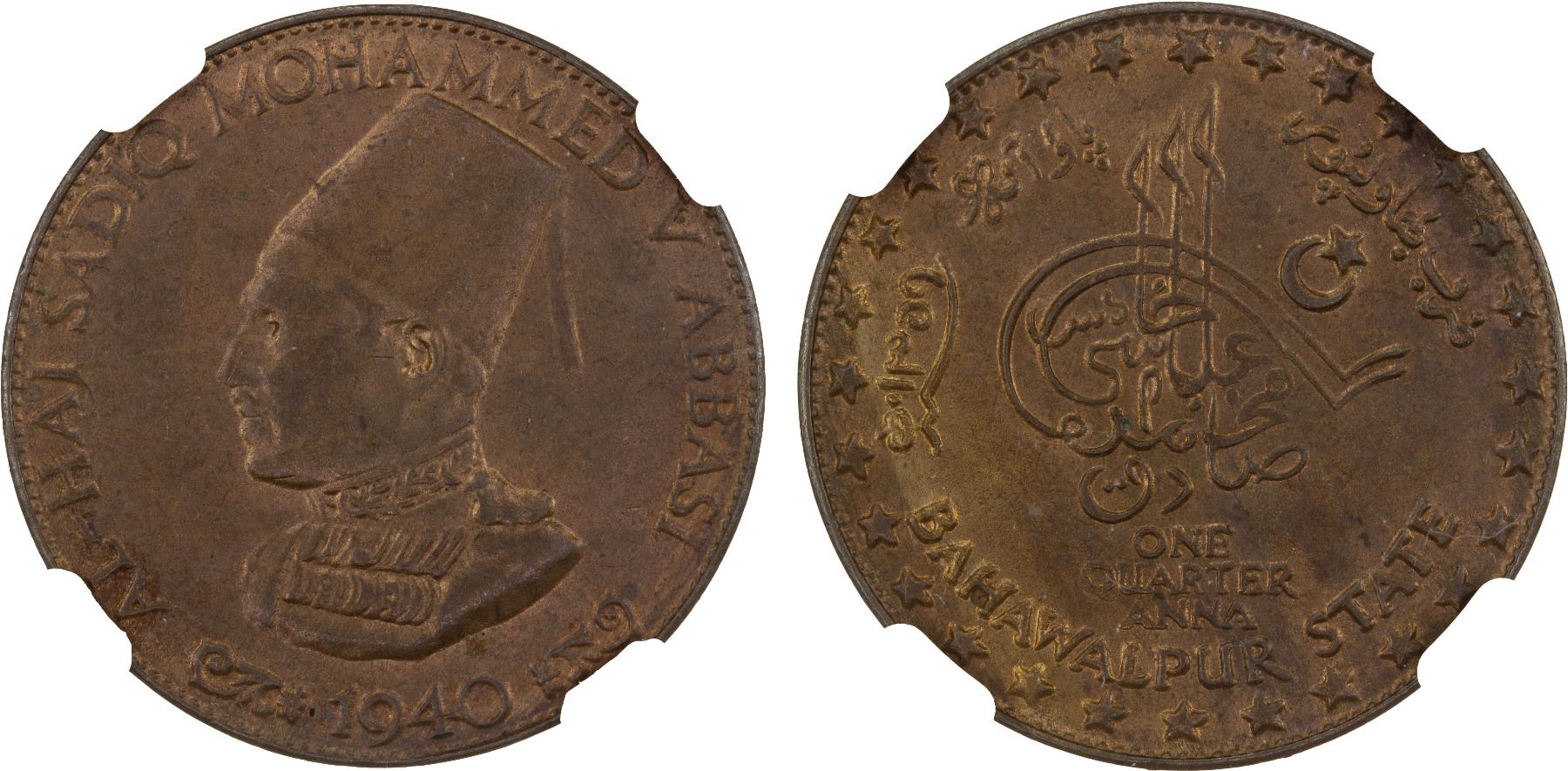 BAHAWALPUR: Sadiq Muhammad Khan V, 1907-1947, AE 1/4 anna, Bahawalpur, AH1350 (1940), Y-13, NGC graded MS64 RB.