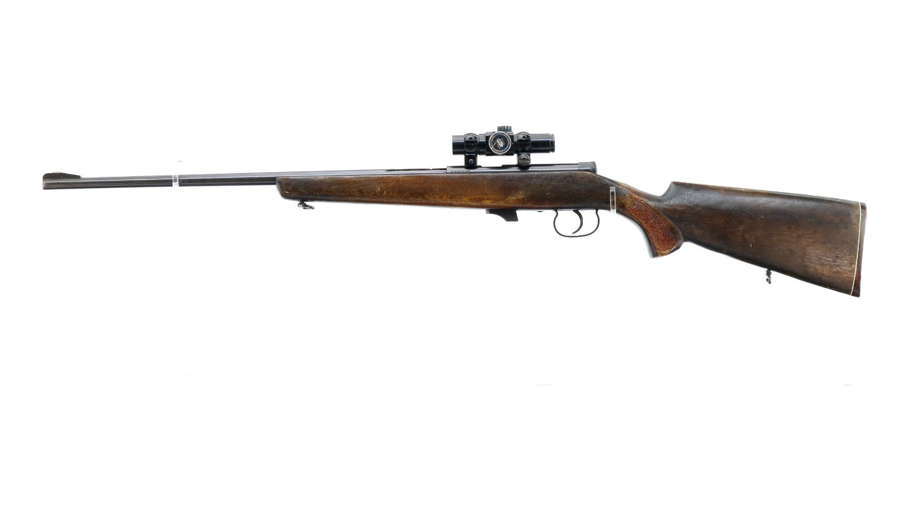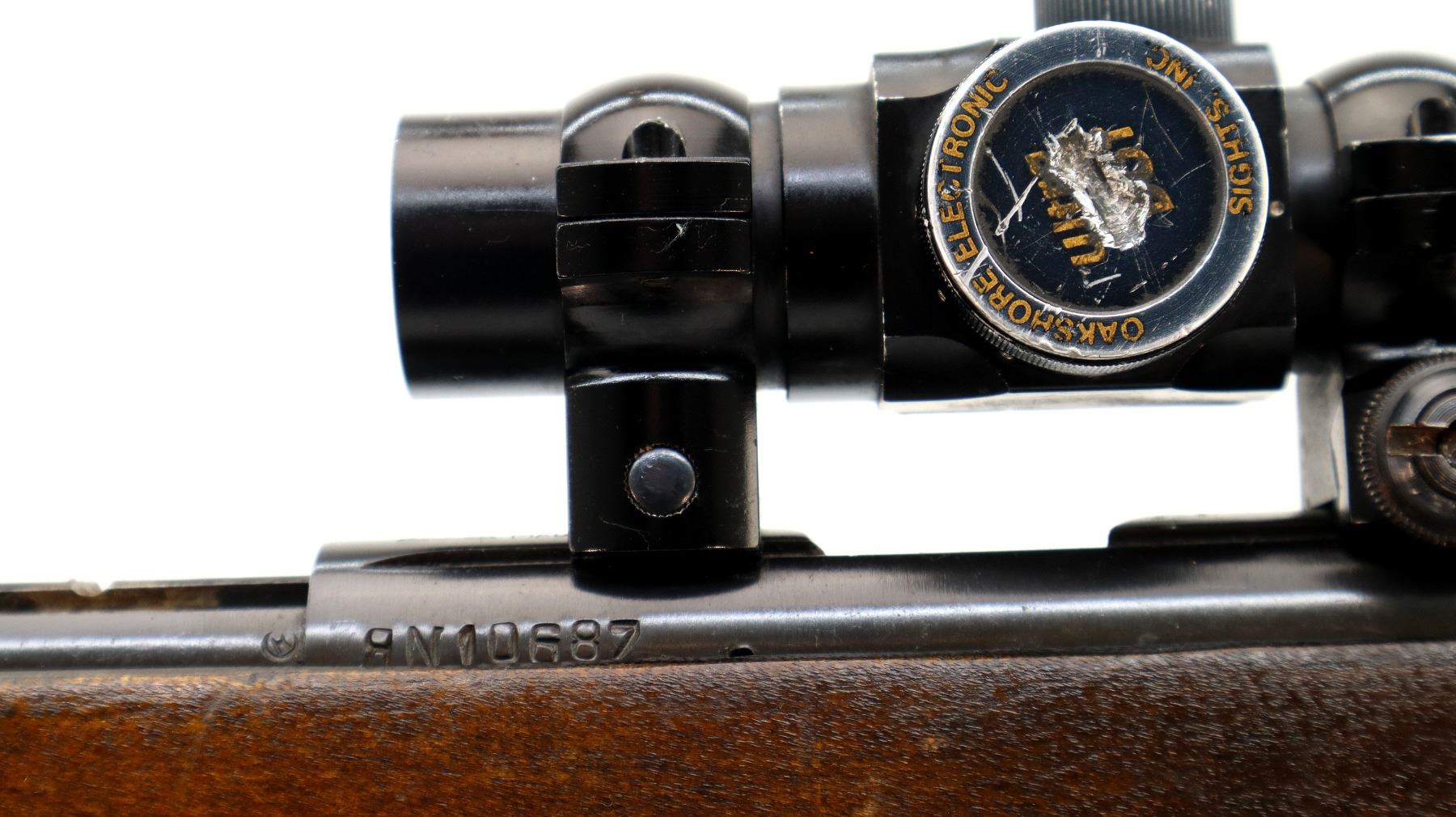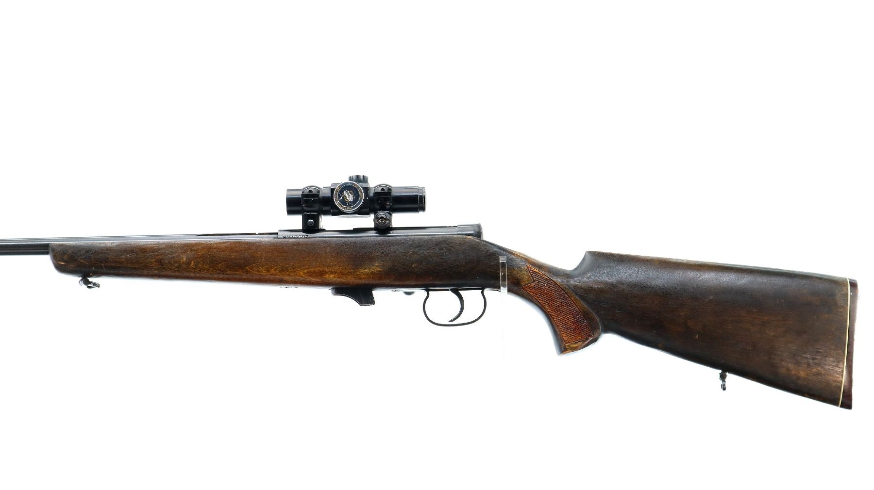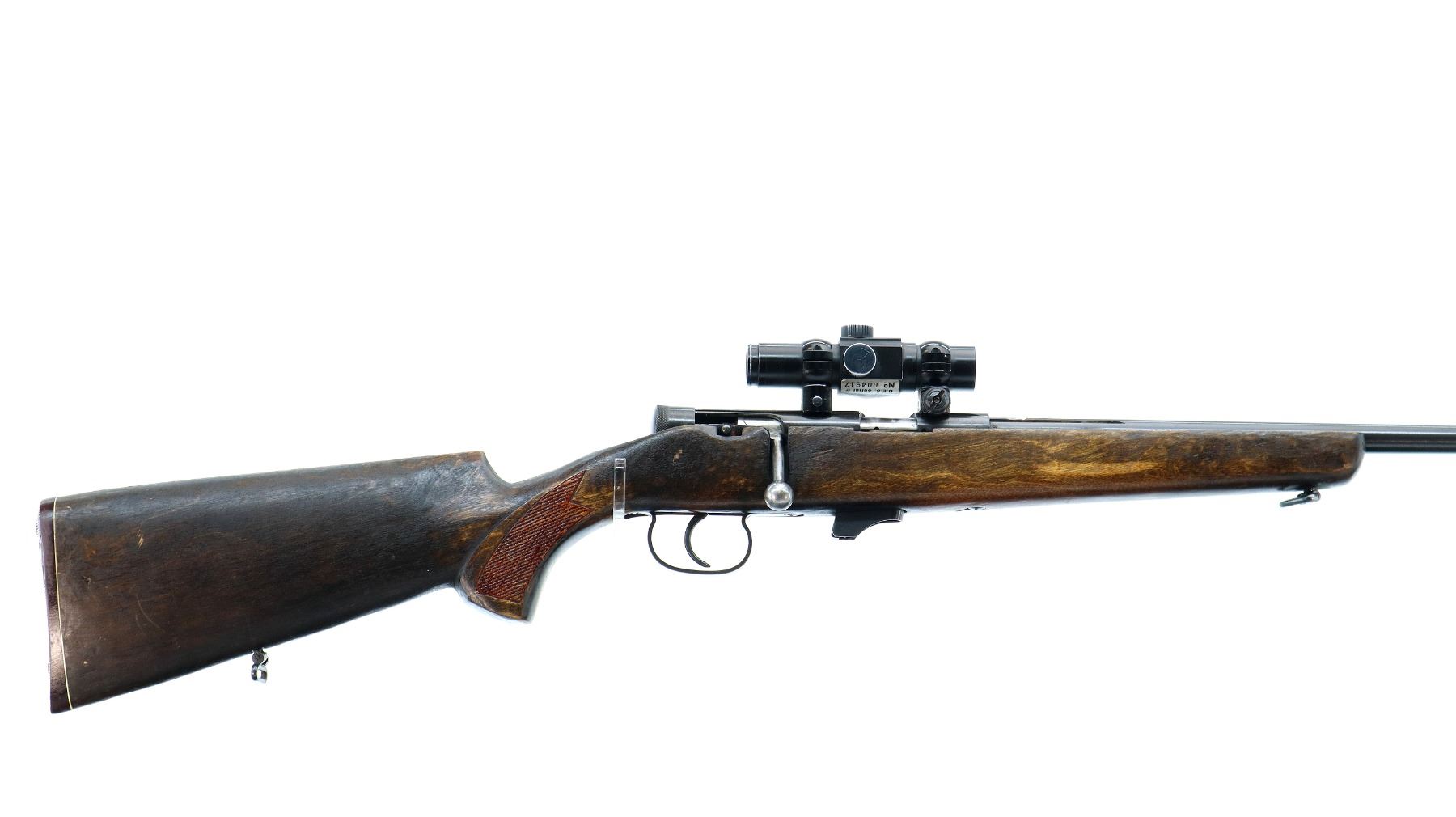 Main Description: Front sight is broken ramp is present, missing complete rear sight, blued finish, grooved receiver with Oakshore Red Dot installed, clear optics, illumination functions, missing rubber eye cup. Smooth bolt knob. One piece wood stock, checkered pistol grip, grooved brown polymer butt plate, sling swivels.