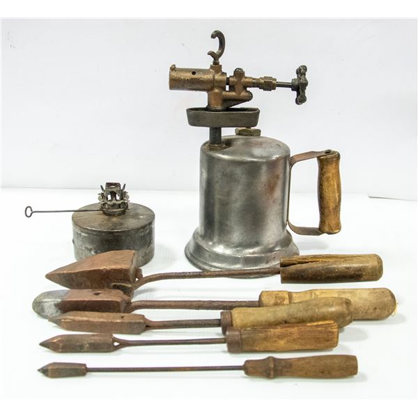 ANTIQUE BLOW TORCH WITH 5 IRONS