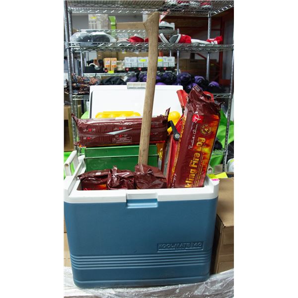 FIRE LOGS, AXE, JACK, COLLEMAN STOVE, COOLER