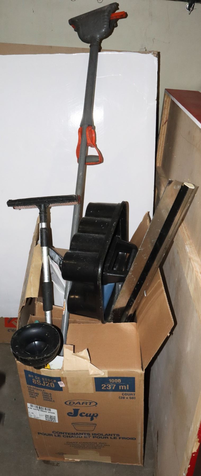 CLEANING SUPPLIES, EMPTY PICKLE JARS, PLUNGER, TICKET/ ORDER HOLDER, AND MORE