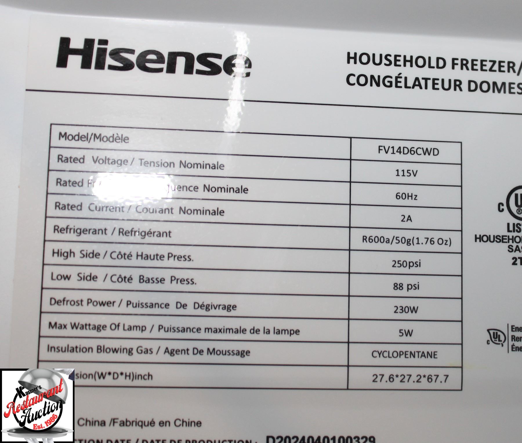 MODEL 3 FV14D6CDW, 115 VOLTS, 60 HZ, 2 AMPS, 230 WATTS, 27.5" X 27.5" X 68" ** ALL BAILIF ITEMS ARE SOLD AS IS WHERE IS, ABSOLUTLY NO REFUNDS OR RECONSIGNMENT **