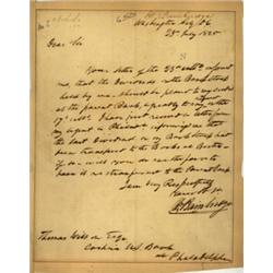 <b>1036. WILLIAM BAINBRIDGE</b> (1744 - 1833) American naval officer captured at Tripoli, and later commanded the Constitution in her victory over the Java. A.L.S. 1p. 4to., Washington, July 23, 1825 to the Cashier of the Bank of the United States in Philadelphia concerning <i>"...The Dividend on the Bank Stock kept by me...my agent in Philad. informs me that the last Dividend on my Bank Stock had been transferred to the Bank at Boston - if so - will you do me the favor to have it retransfer to the Present Bank...</i>". Laid in to a larger sheet, left margin rough, otherwise very good. <b>$200-300</b>