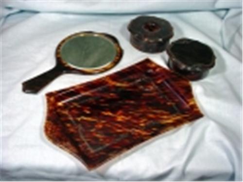 BAKELITE (LOOKS LIKE TORTOISE SHELL) VANITY SET INCLUDING TRAY, HAND MIRROR, AND TWO CONTAINERS WITH