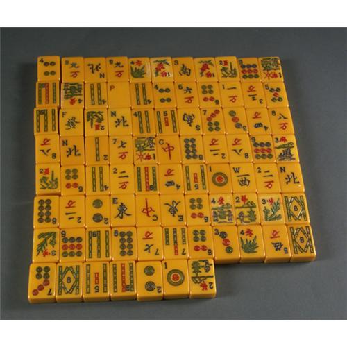 MAH JONG: A vintage Bakelite Mah Jong set in case. Included in the set are 164 Bakelite tiles, a bettor, two die, five Bakelite tile racks with chip racks and chips. The tiles are a deep butterscotch color, the tile racks are green, a dark green, red, deep red and an amber color with marbleized effects. The case shows some signs of mildew on exterior cover, the tile racks have some corrosion on metal parts and some of the tiles have tape residue.