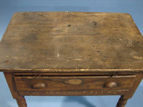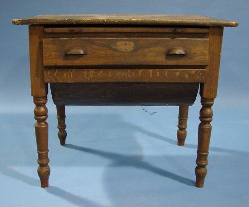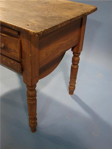 BAKER’S SHERATON STYLE SOFTWOOD & OAK TABLE. Has cutting board, drawer, & flour bin. Turned legs. Has softwood two-board top on oak base. 30” H, 36” W, 23.5” D