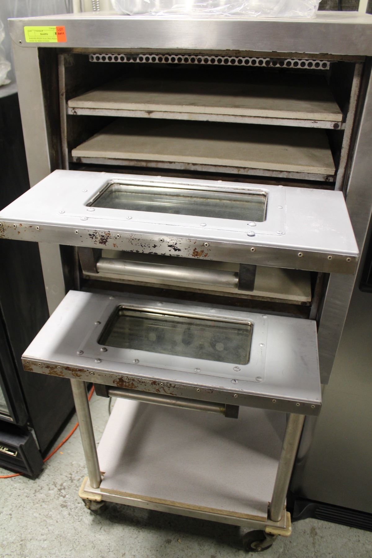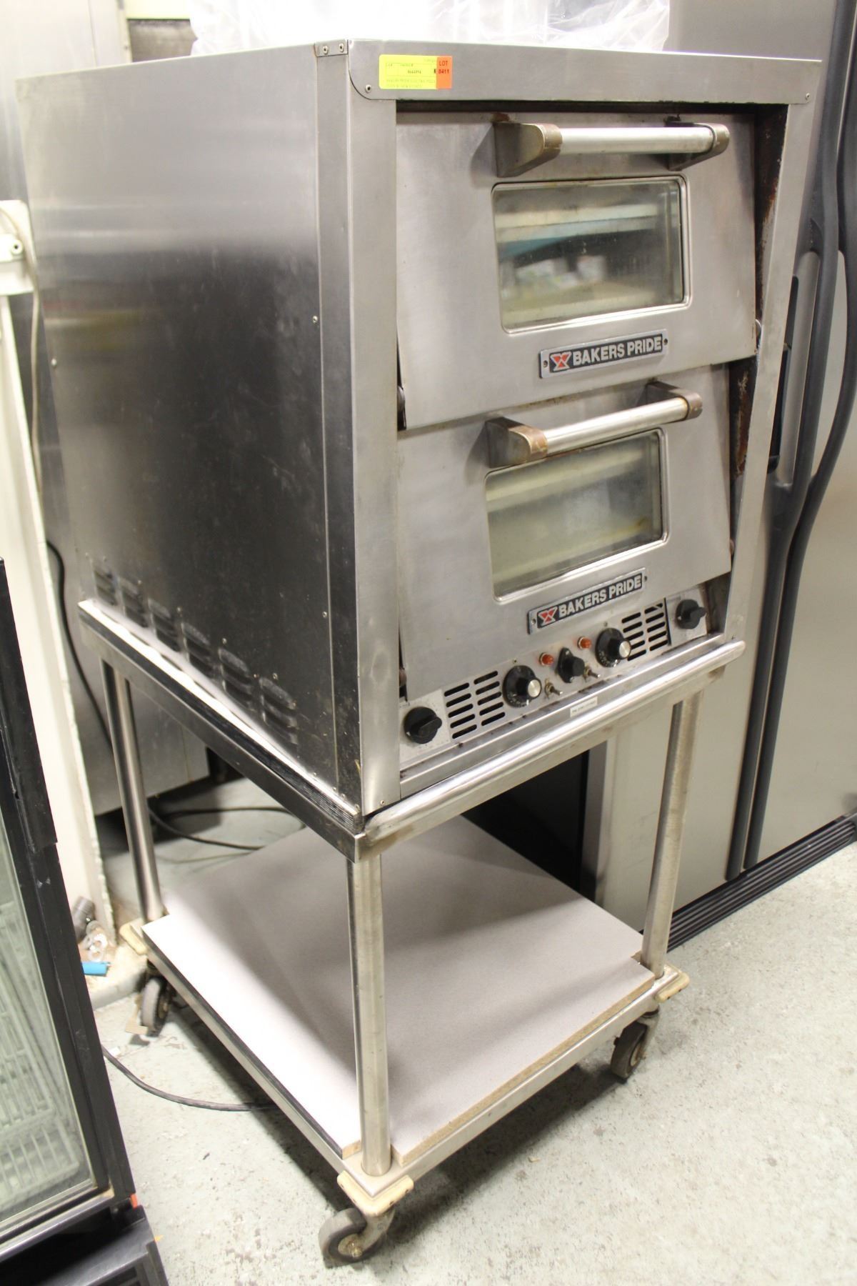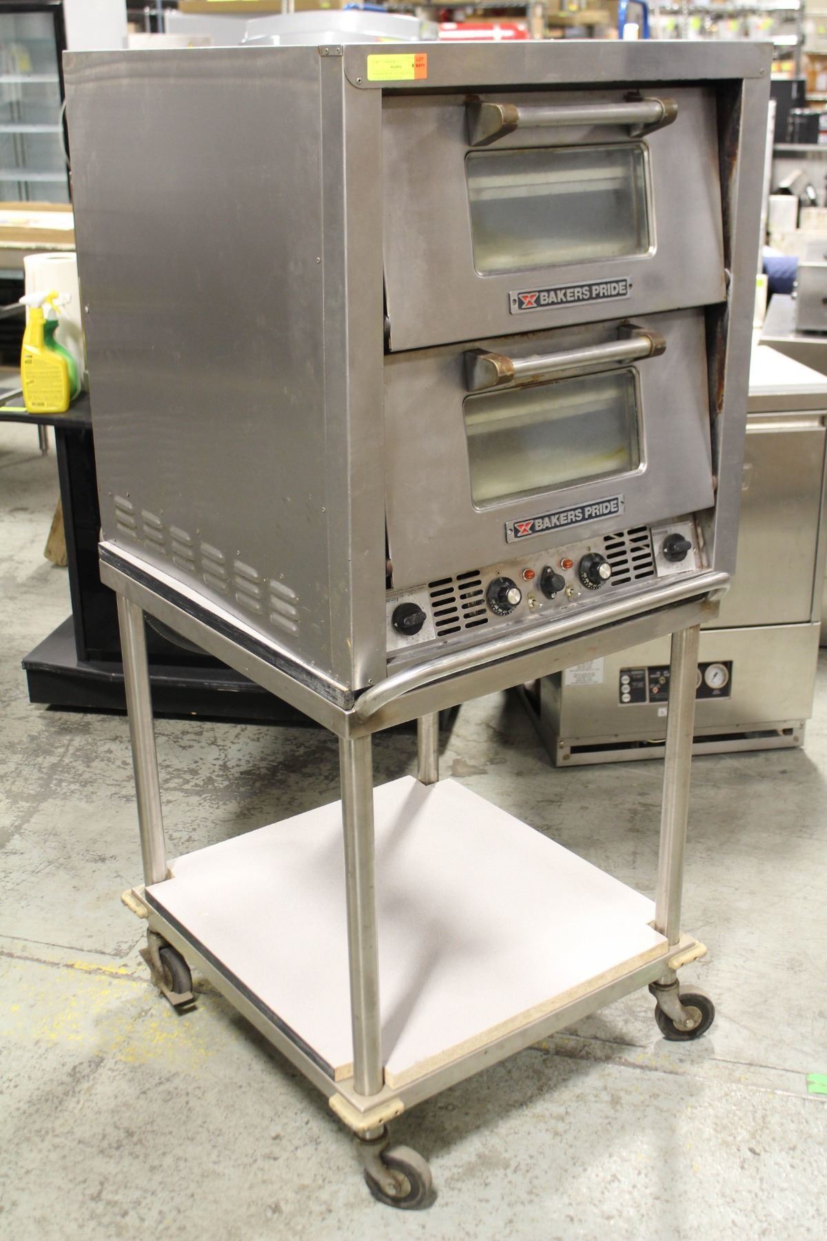 M# P44, THREE PHASE, 208V. 4 DECK, 2-DOOR. 27" X 30" X 30". INCLUDES STAINLESS STEEL STAND ON WHEELS W/ UNDERSHELF STORAGE.