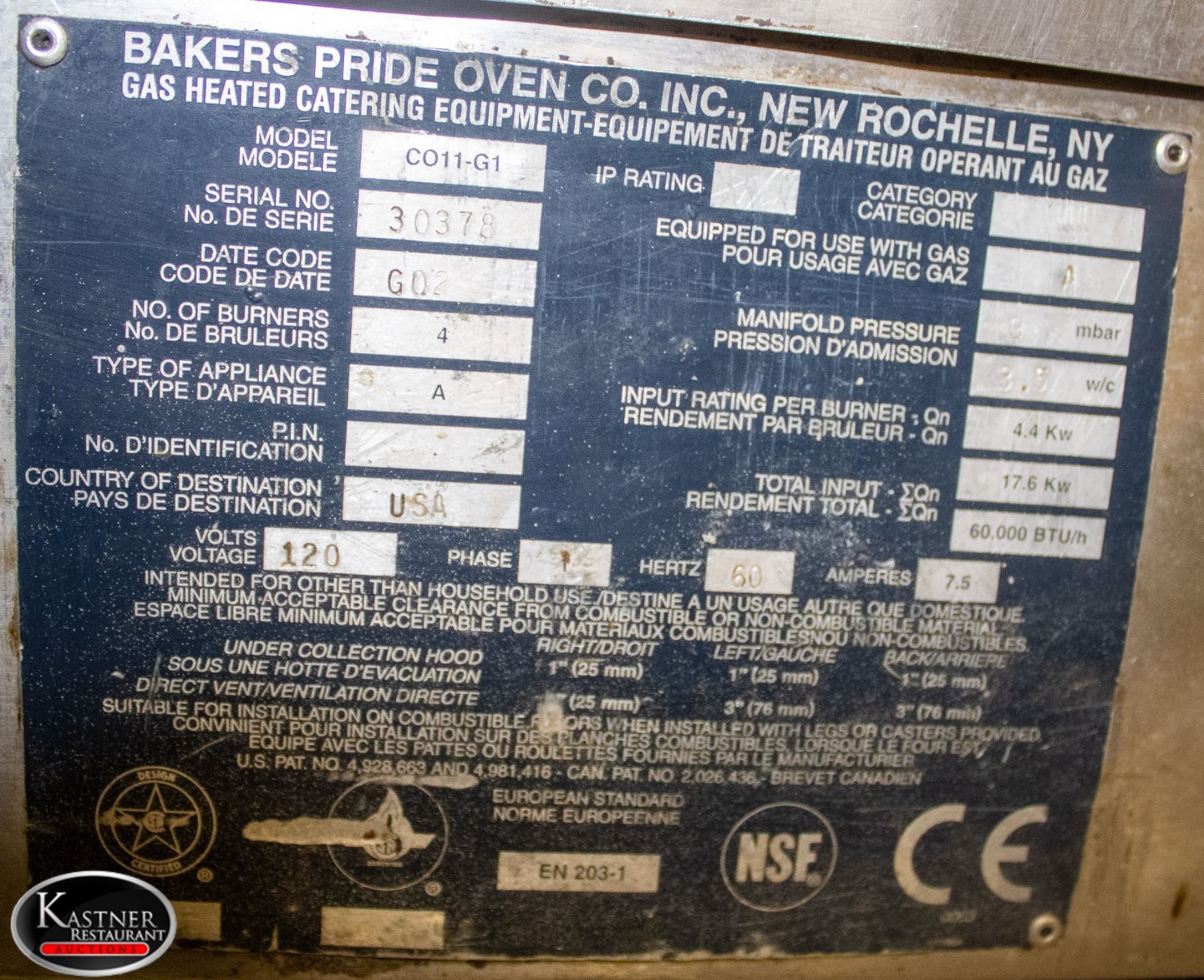 MODEL # CO11-G, 120 VOLTS, PHASE 1, HO HZ, 7.5 AMPS, 4.4 KWP, 60,000 BTU / HOUR, HAS LEGS BUT MISSING BOLTS TO ATTACH TO THE CONVECTION OVEN. APPROX 38.5" X 40" X 62" ON LEGS
