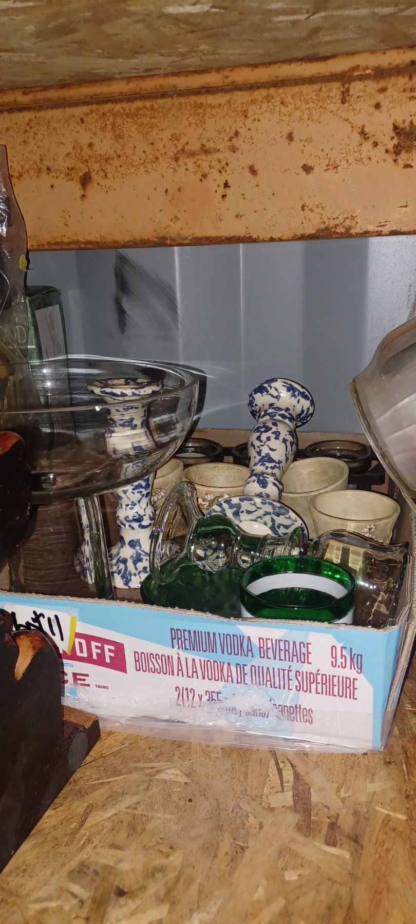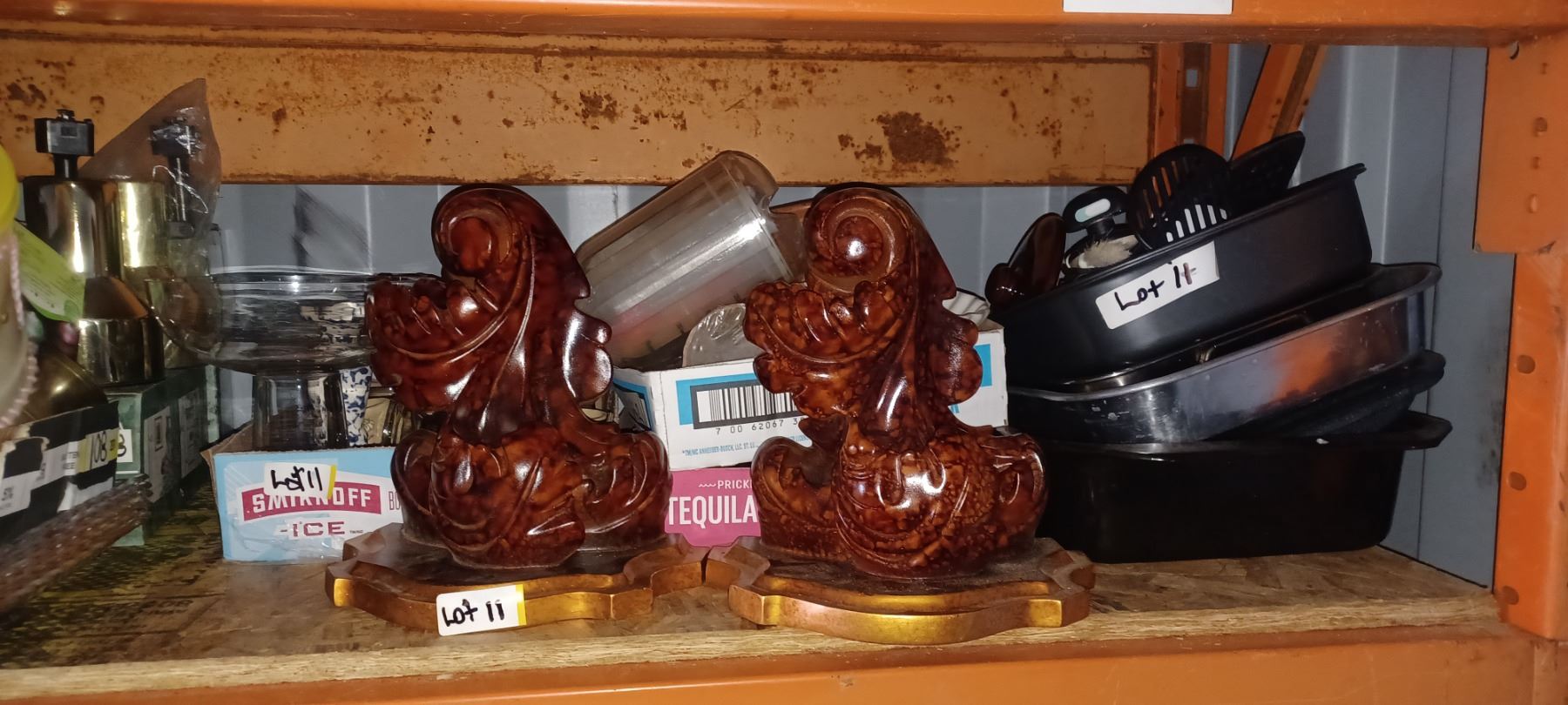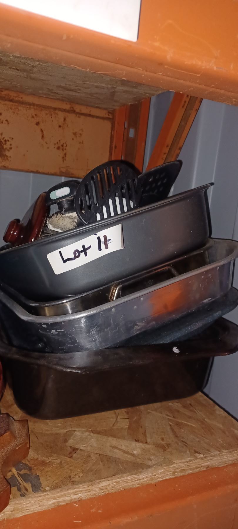 BAKING PANS, GLASSWARE, 2 WOOD CURTAIN ENDS