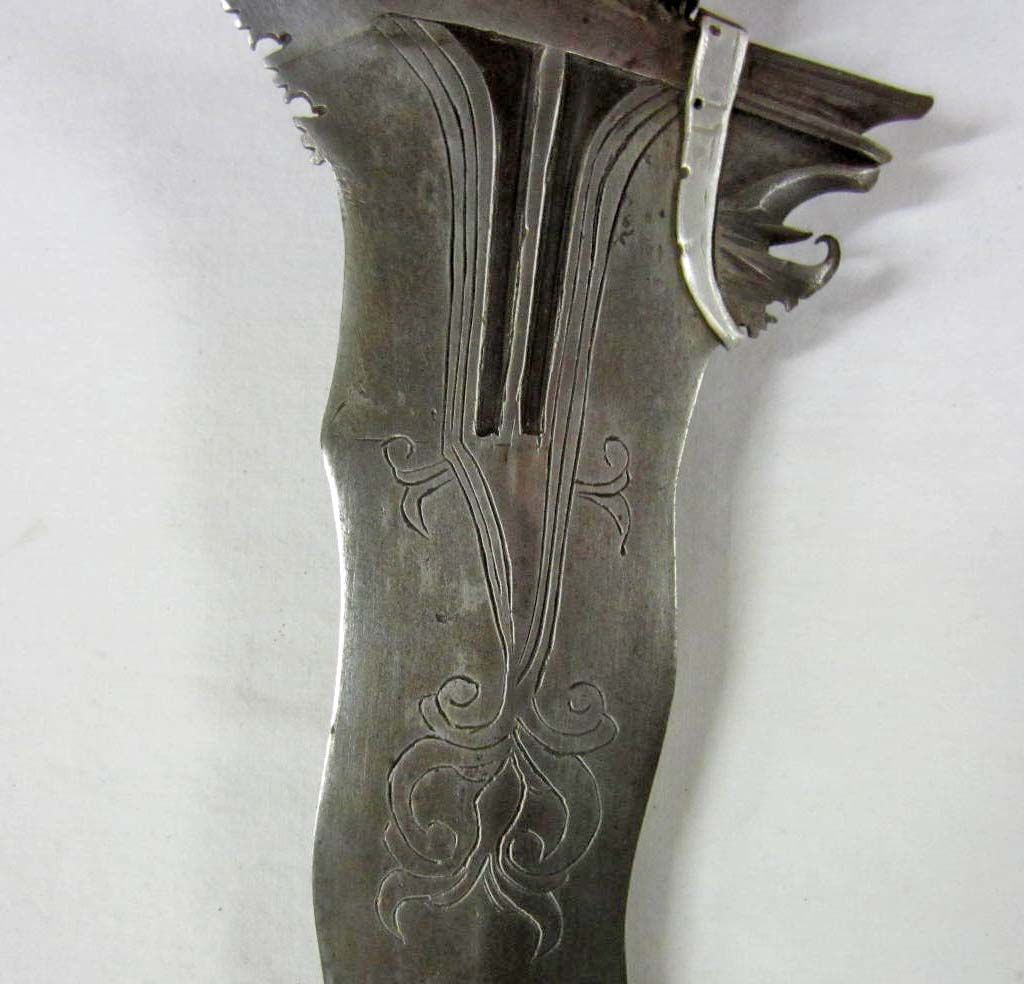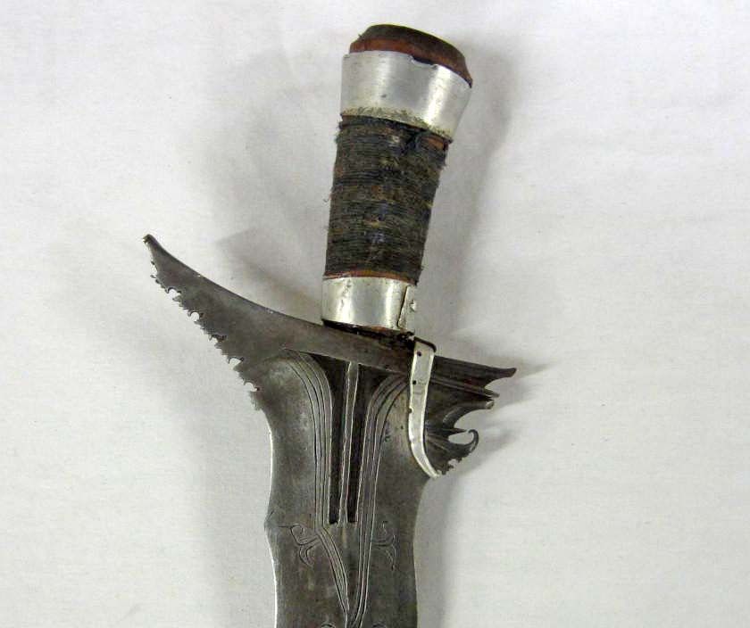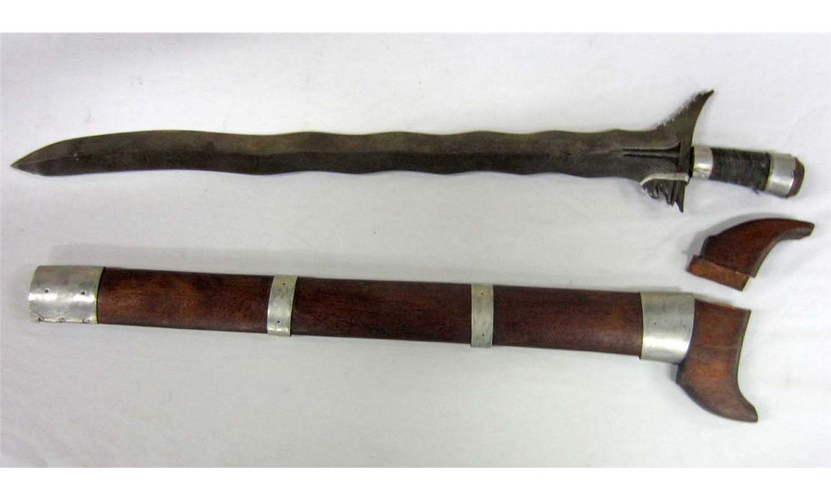 Approx. 29.25" long overall. The fancy engraved steel blade is approx. 2" wide by 24 9/16" long. Has a wood scabbard w/ aluminum fittings. The wood handle is cloth wrapped w/ aluminum fittings. Nice wall hanger.