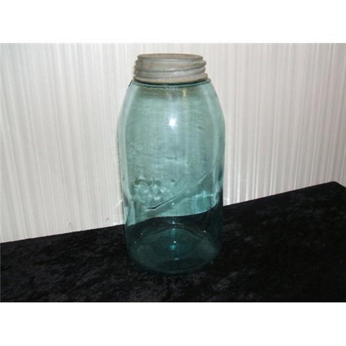 "Ball" 2 quart Teal Green Canning Jar with original Tin lid. Inside of Tin lid reads, " Genuine Zinc Cap For Ball Mason Jars" 9.5 inches tall.