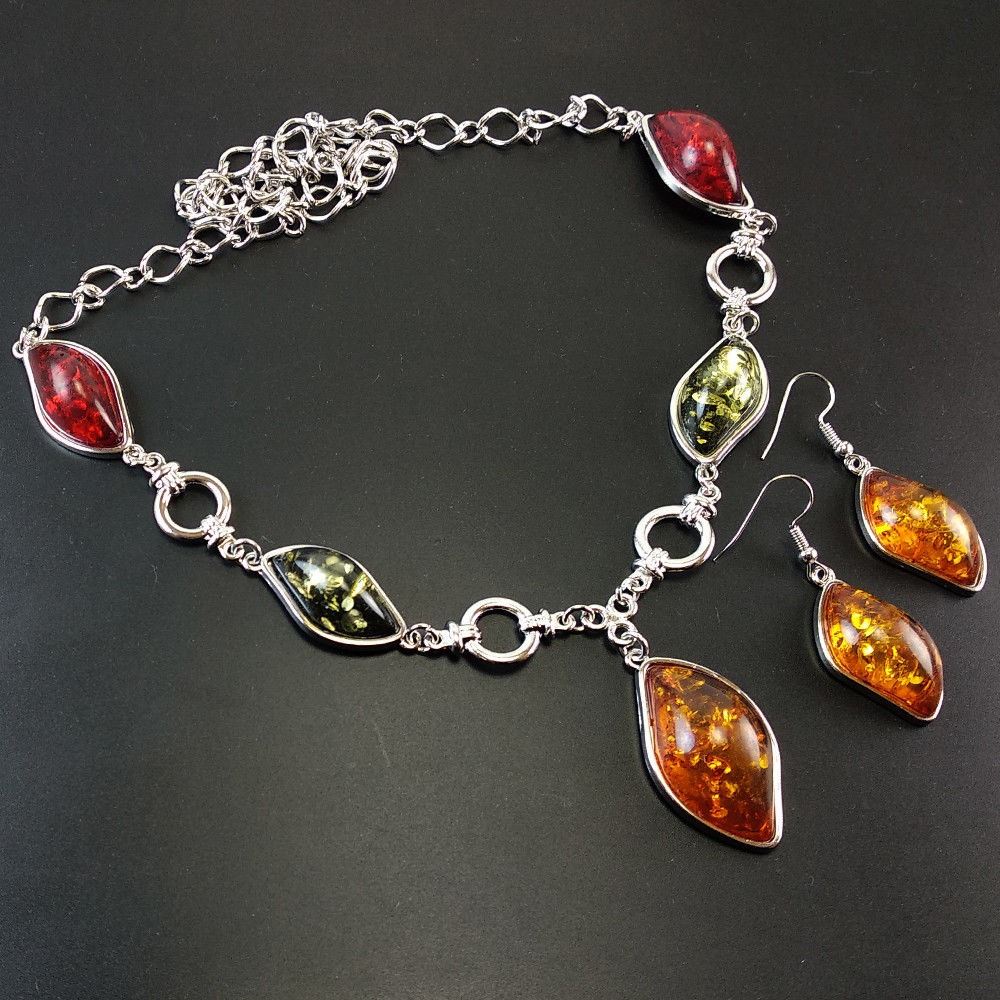 BALTIC AMBER GEMSTONE SILVER PLATED HANDMADE NECKLACE WITH EARRING , Gemstone : Baltic Amber , Necklace Size : 18 Inches (With adjustable links) , Necklace Weight : 42.100 Gram