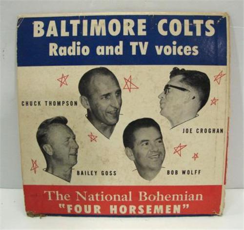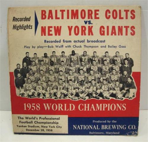 BALTIMORE COLTS AND NEW YORK GIANTS 1958 WORLD CHAMPIONSHIP RECORD. 45 RPM. Produced by National Bohemian Beer. Includes cover and record. Side A contains the fourth quarter radio broadcast of the 1958 World Championship game with Chuck Thompson and Bob Wolff. Side B contains the Sudden Death radio broadcast. Cover shows some minor wear. Record shows minor wear with a very small amount of loss at edge.