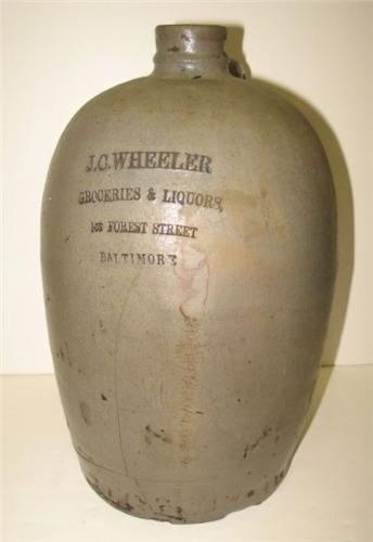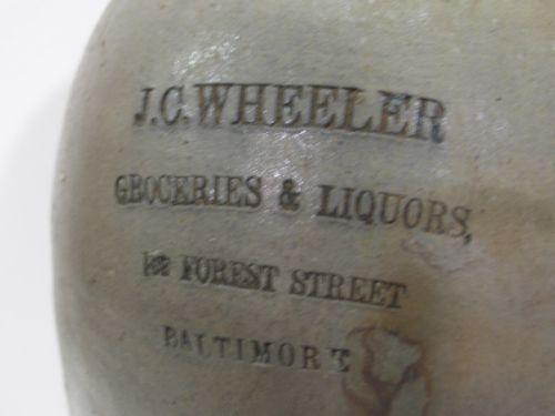 BALTIMORE, MARYLAND HANDLED STONEWARE JUG. Stamped “J.C. Wheeler-Groceries & Liquors-159 Forest Street-Baltimore”. Jug has been repaired and shows numerous vertical cracks and horizontal cracks at bottom. 11.25” H