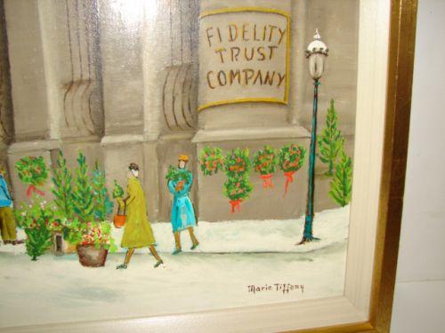 BALTIMORE, MARYLAND OIL ON BOARD PAINTING. Depicts the Fidelity Trust Company building at Christmas time. Signed in lower right "Marie Tiffany". 17.75" x 14" framed.