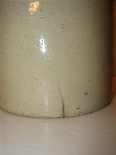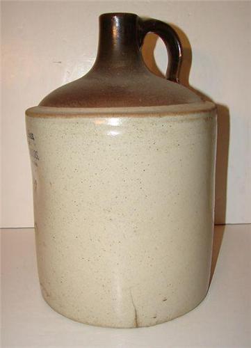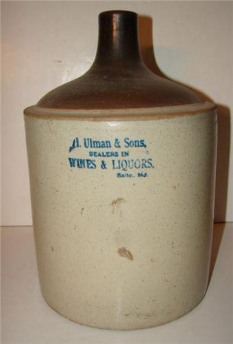 BALTIMORE, MARYLAND BROWN & WHITE STONEWARE JUG. Marked on body in blue “I. Ulman & Sons,/Dealers In/Wines & Liquors/Balto., Md.” Shows one chip at edge of base. Shows one vertical hairline crack at bottom of body running through base. 13.5” H