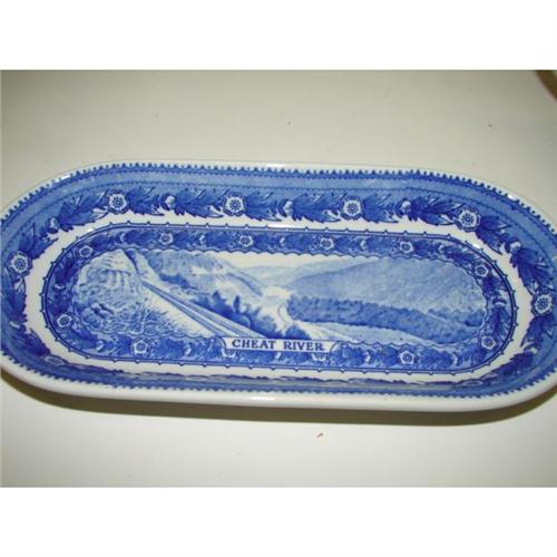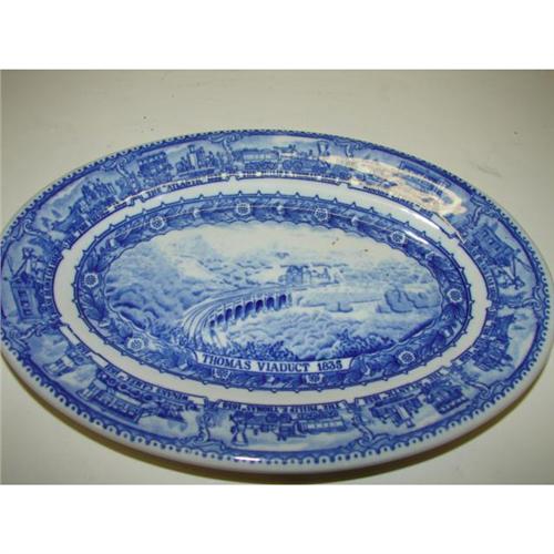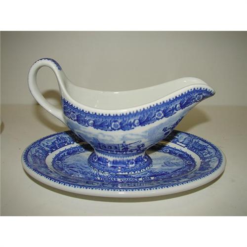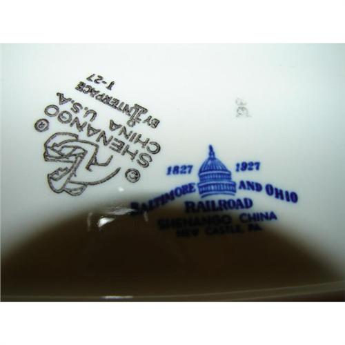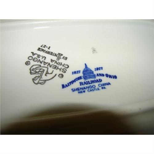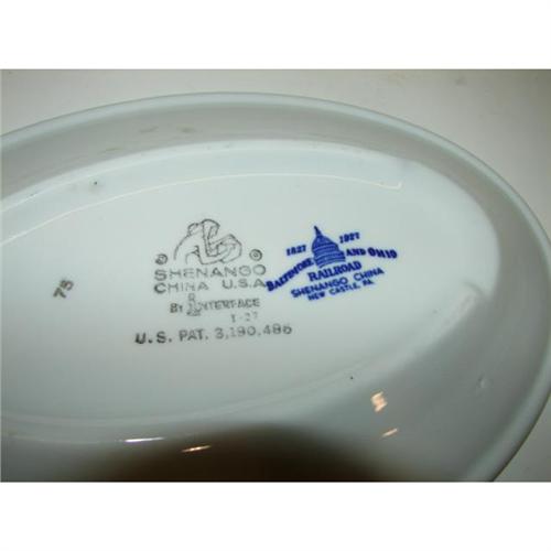 3 PIECES OF SHENANGO BALTIMORE & OHIO RAILROAD CHINA. Consists of gravy boat (4” H, 7” L) with underplate (8” L) and pickle dish (10” L). Underplate and pickle dish are marked on bottom with Shenango/Capitol mark and Shenango/black Indian potter I stamp. Gravy boat is marked on bottom with Shenango/Capitol mark and Shenango/rubber stamp.