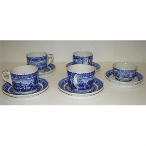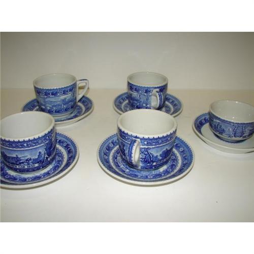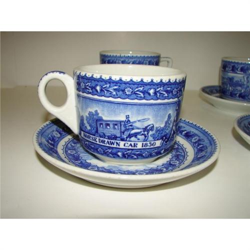10 PIECES OF BALTIMORE & OHIO RAILROAD CHINA. Consists of 4 cups (3” H) and saucers (6” Dia.) and a handless cup (2” H) and saucer (5.75” Dia.). Two cups are marked on bottom with Scammell’s/Design Patented marks. One cup is marked on bottom with Shenango/Capitol mark and another is marked on bottom with Shenango/Capitol mark and the Shenango/rubber stamp mark. Handless cup is marked on bottom with Shenango/Capitol mark and the Shenango/rubber stamp mark. Four saucers are marked on bottom with Shenango/Capitol mark. Handless cup saucer is marked on bottom with Shenango/Capitol mark and Shenango/black Indian potter I stamp.