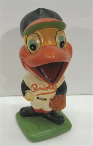 BALTIMORE ORIOLES VINTAGE BOBBLEHEAD. Depicts Oriole mascot in uniform with mitt and ball. Marked with sticker at bottom “Lego, Japan”. Excellent overall condition. 6.5” H