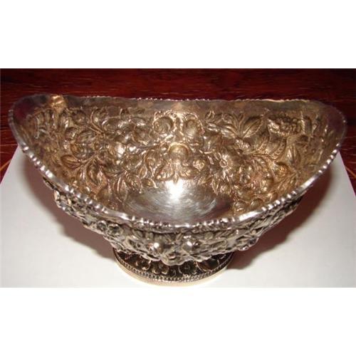 1900'S Sterling Silver Repousse Schofield Baltimore Rose Unusual Open Sauce, Gravy or Sugar Bowl. This is one of three well known Baltimore Silversmiths, the others being kirk and stieff in the Early 20TH Century that gave Baltimore the reputation of the City of Fine Silver. All three of these companies made this wonderful repousse pattern in sterling silver flatware and serving pieces such as Tea Sets,Bowls, Trays, Wine Goblets, Tankards, etc. This is a very rare unusual form. This piece along with other Schofield pieces recently came out of a Baltimore Estate. Fresh to the market, this piece has a wondereful Deeep Repousse Pattern of Roses that goes all the way around the sides of this piece and all the way to the foot. It has a plain inside sterling bottom with No Monogram. Under the base it is marked Schofield Sterling with the #1410. The top opening measures 6 1/4" X 4" and rests on a oval base that measures 3 1/4" X 2 1/4". Excellent Condition