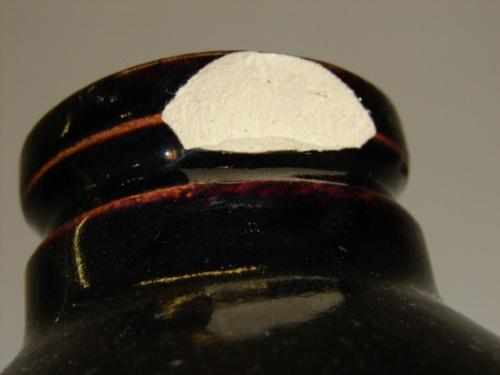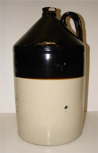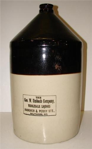 LARGE BALTIMORE, MARYLAND BROWN & WHITE STONEWARE JUG. Circa 1894-1916. Marked “The/Geo. W. Umbach Company/Wholesale Liquors/Hanover & Perry Sts./Baltimore, MD.” Shows one chip at spout and two small chips at top of handle. 20” H