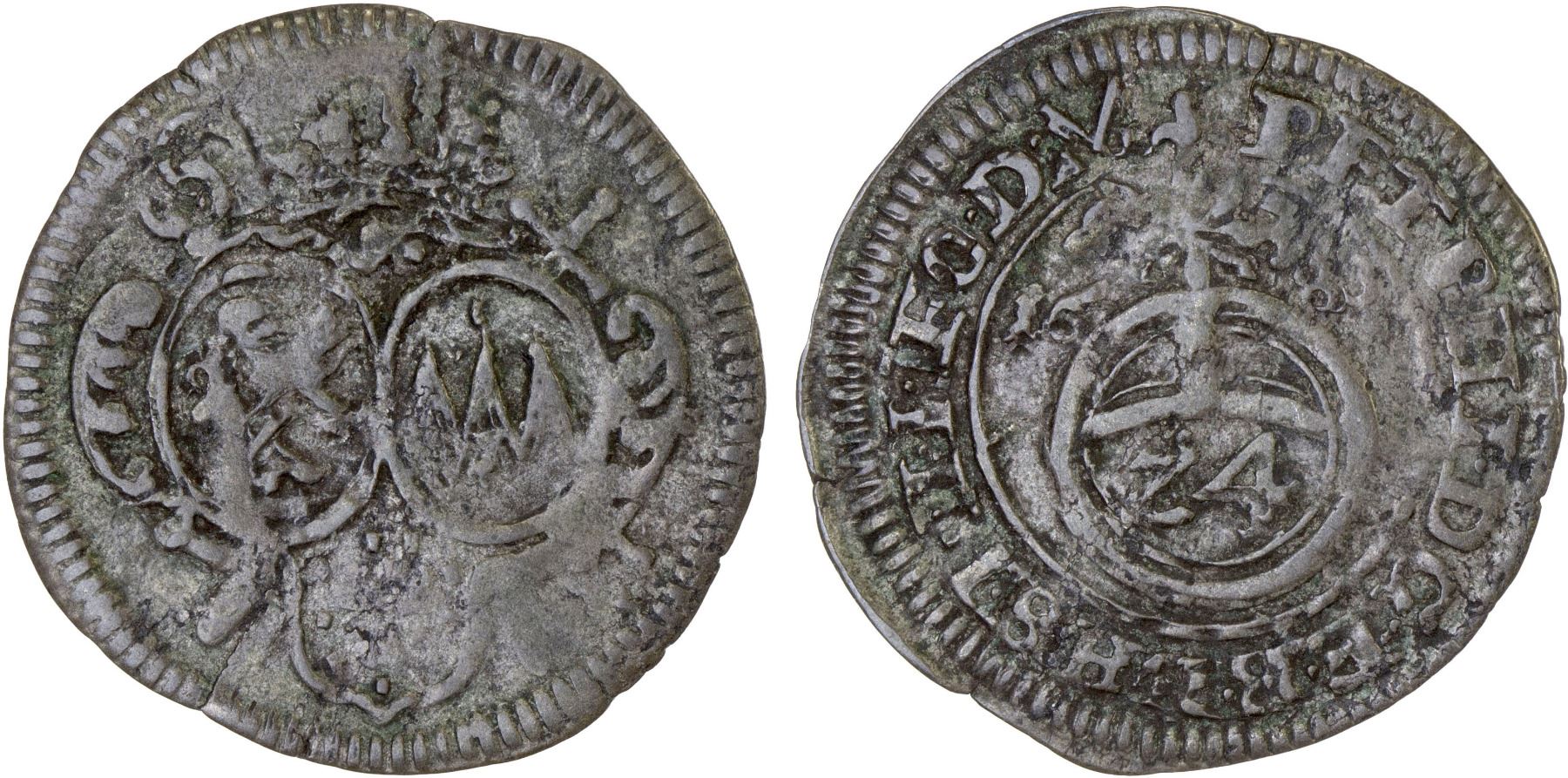 BAMBERG: Peter Philipp von Dernbach, 1672-1683, AR groschen (1.34g), 1683, Krug-286v, 23mm Mainz Mint issue, initials AL, crowned coat of arms // "Z4" within orb with date "16 - 83" on either side near top, all within inner circle with PET PHI.D G .E.B.E H S.R.I.PF G.D around, rather crude strike and flan, some doubling, F-VF.