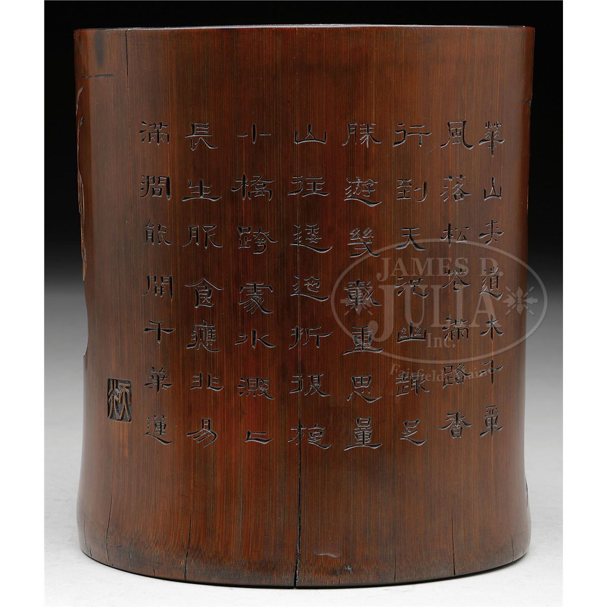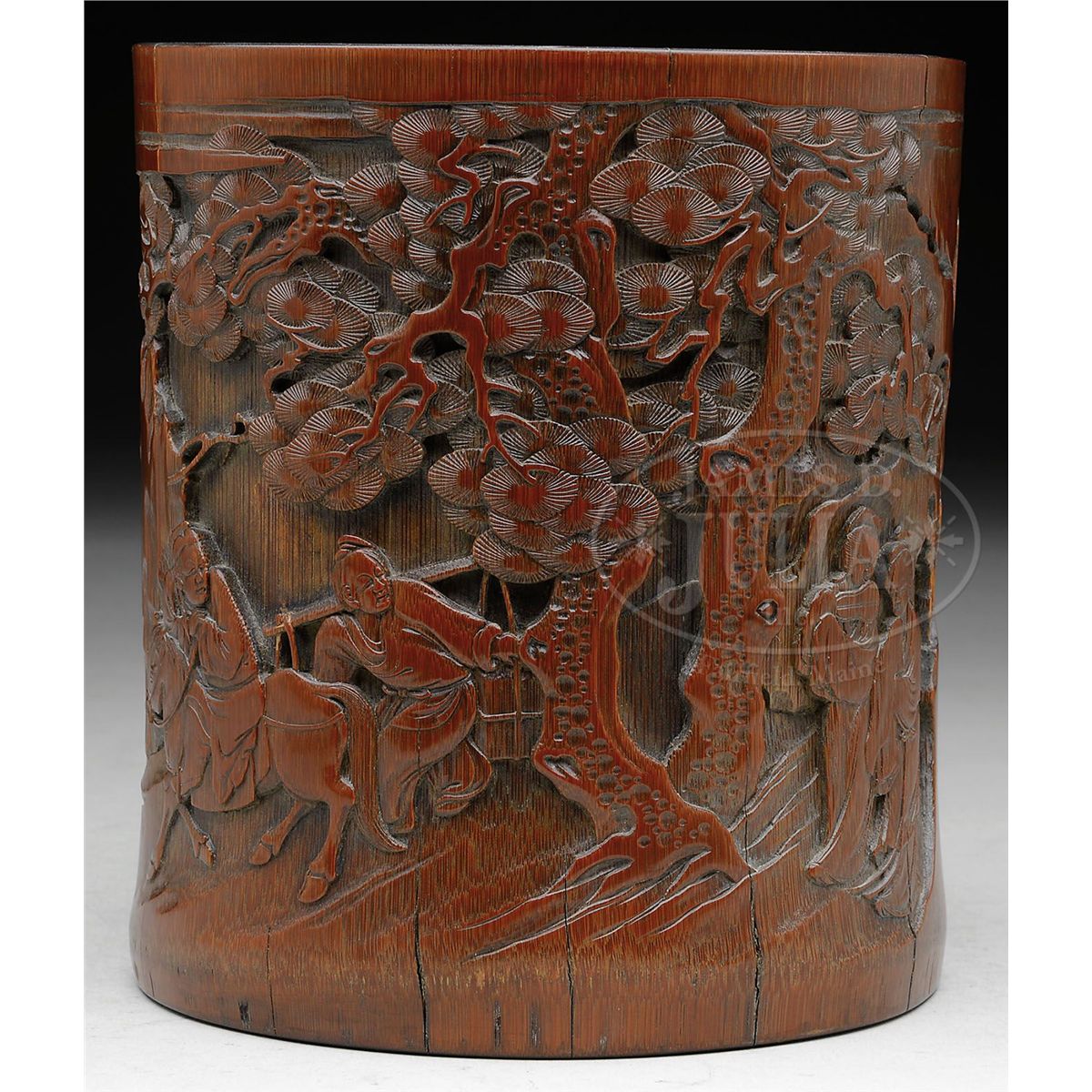 18 century, China. Finely carved brush pot with a scene of two women and two attendants underneath a palm tree. Also has a lengthy poem in Lishu script. SIZE: 6" t x 5-1/2" dia. PROVENANCE: The Estates of John Gerhardt Family Trust. CONDITION: With vertical shrinkage cracks. 9-25043