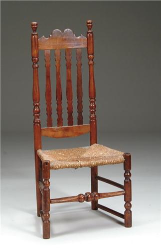 BANISTER BACK RUSH SEAT SIDE CHAIR. Four spindle back with nice shaped crest, turned front legs having a bulbous turned front stretcher. SIZE: 42in. h x 15in. seat h. CONDITION: Good. 9-26567